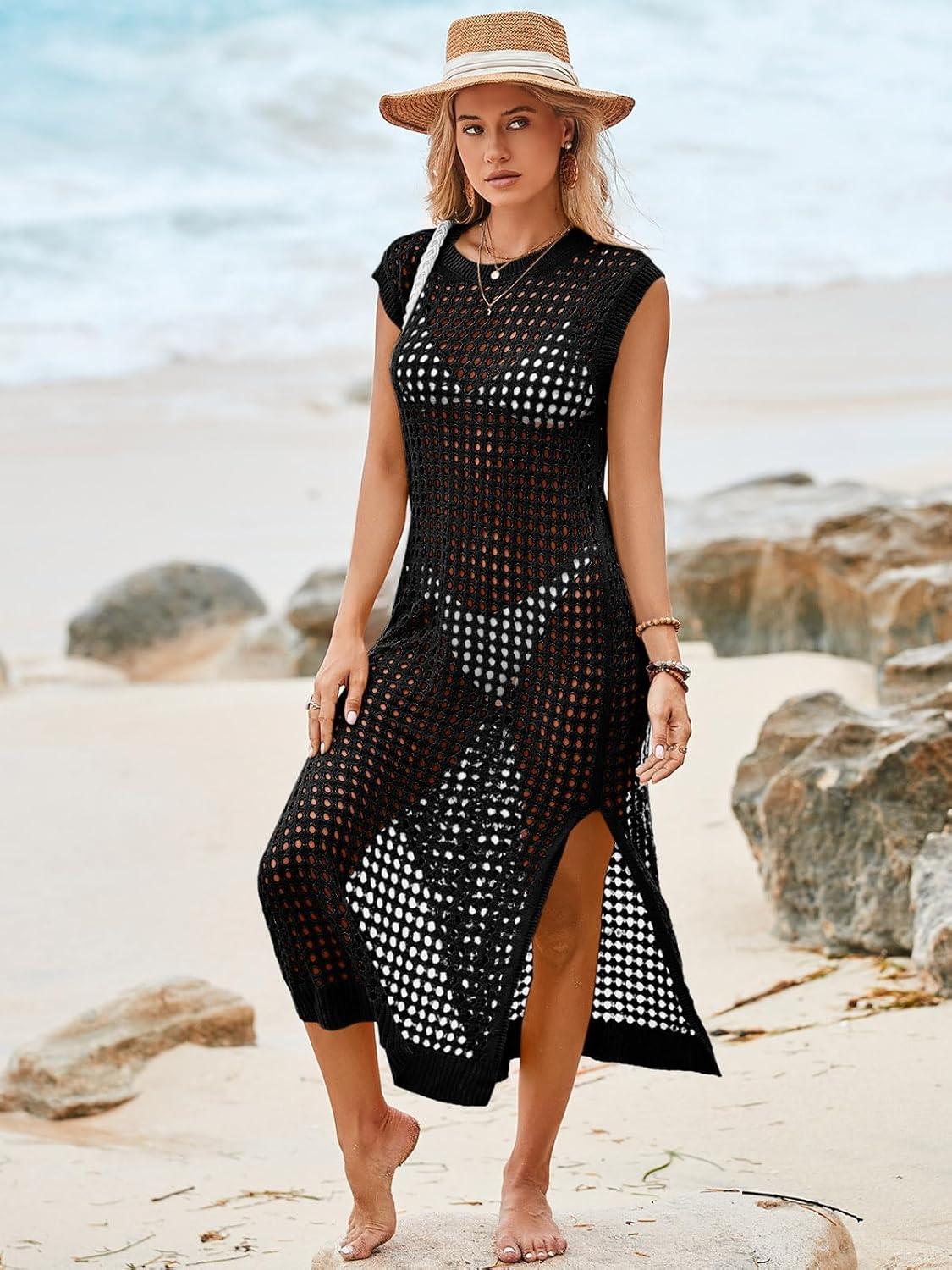 Saodimallsu Womens Crochet Swimsuit Coverup Summer Sleeveless Hollow Out Knit Crewneck Side Split Long Beach Dress(Black)