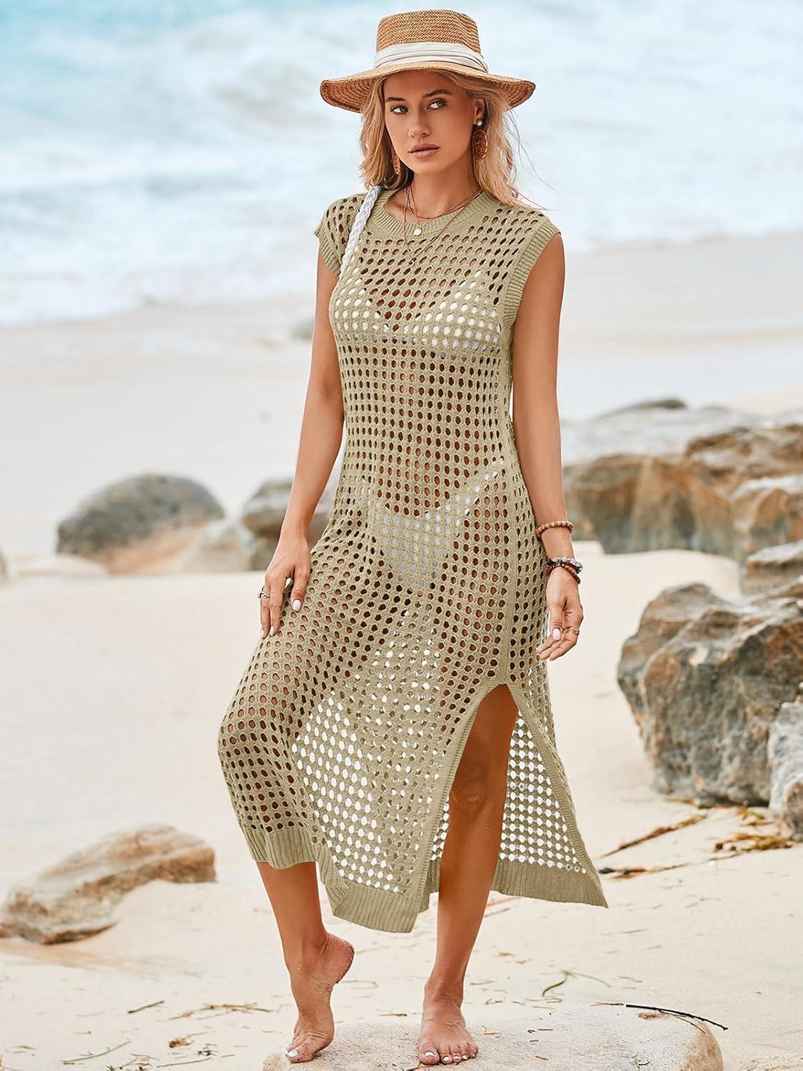 Saodimallsu Womens Crochet Swimsuit Coverup Summer Sleeveless Hollow Out Knit Crewneck Side Split Long Beach Dress(Khaki)