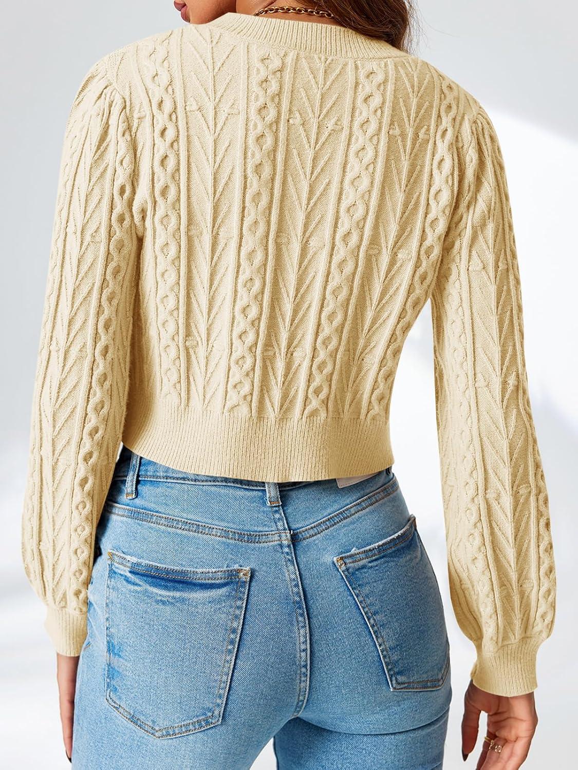 Saodimallsu Womens Cropped Cable Knit Cardigan Sweaters Long Sleeve Bow Tie Front Crew Neck Chunky Sweater Tops(Beige)