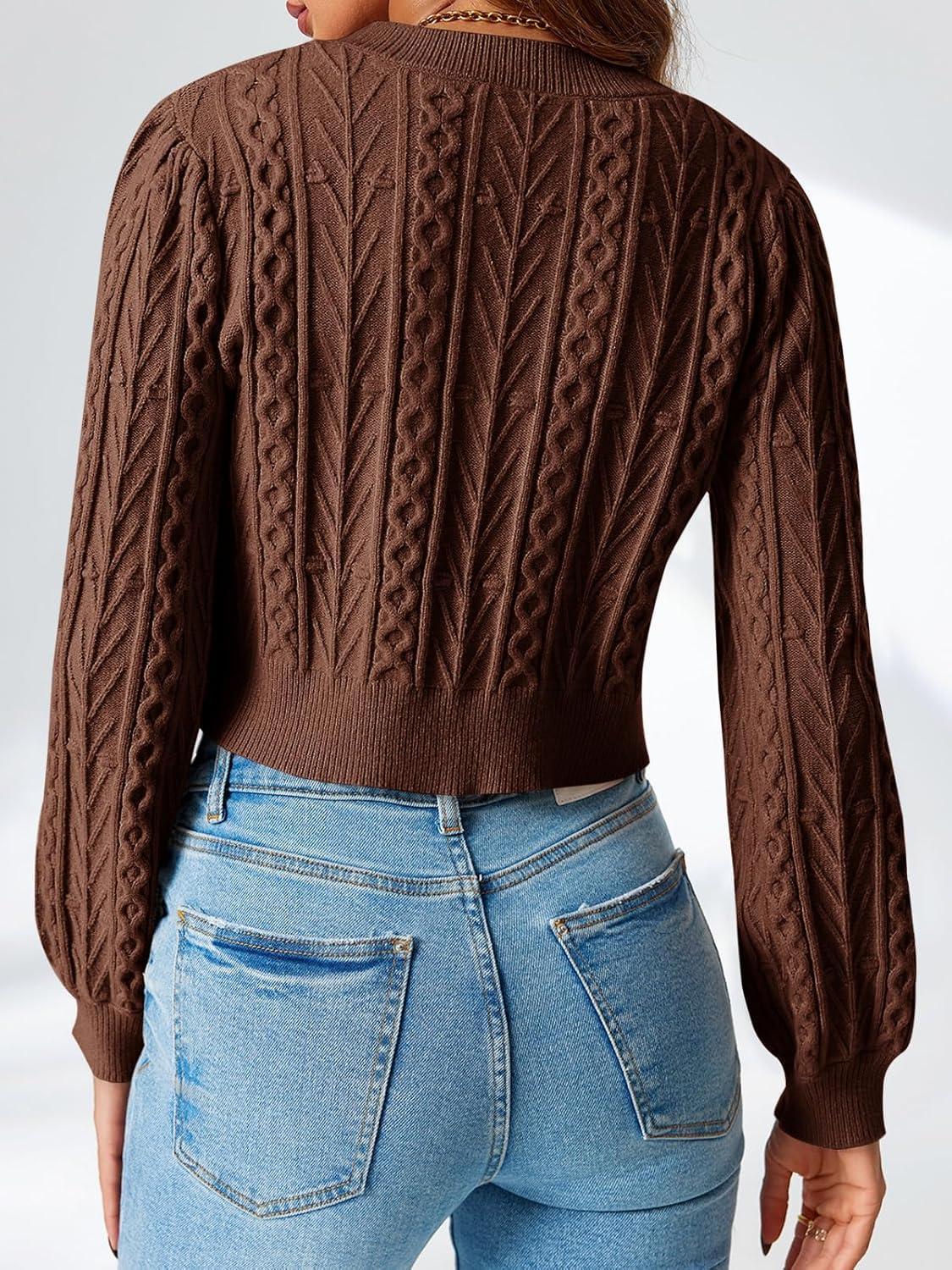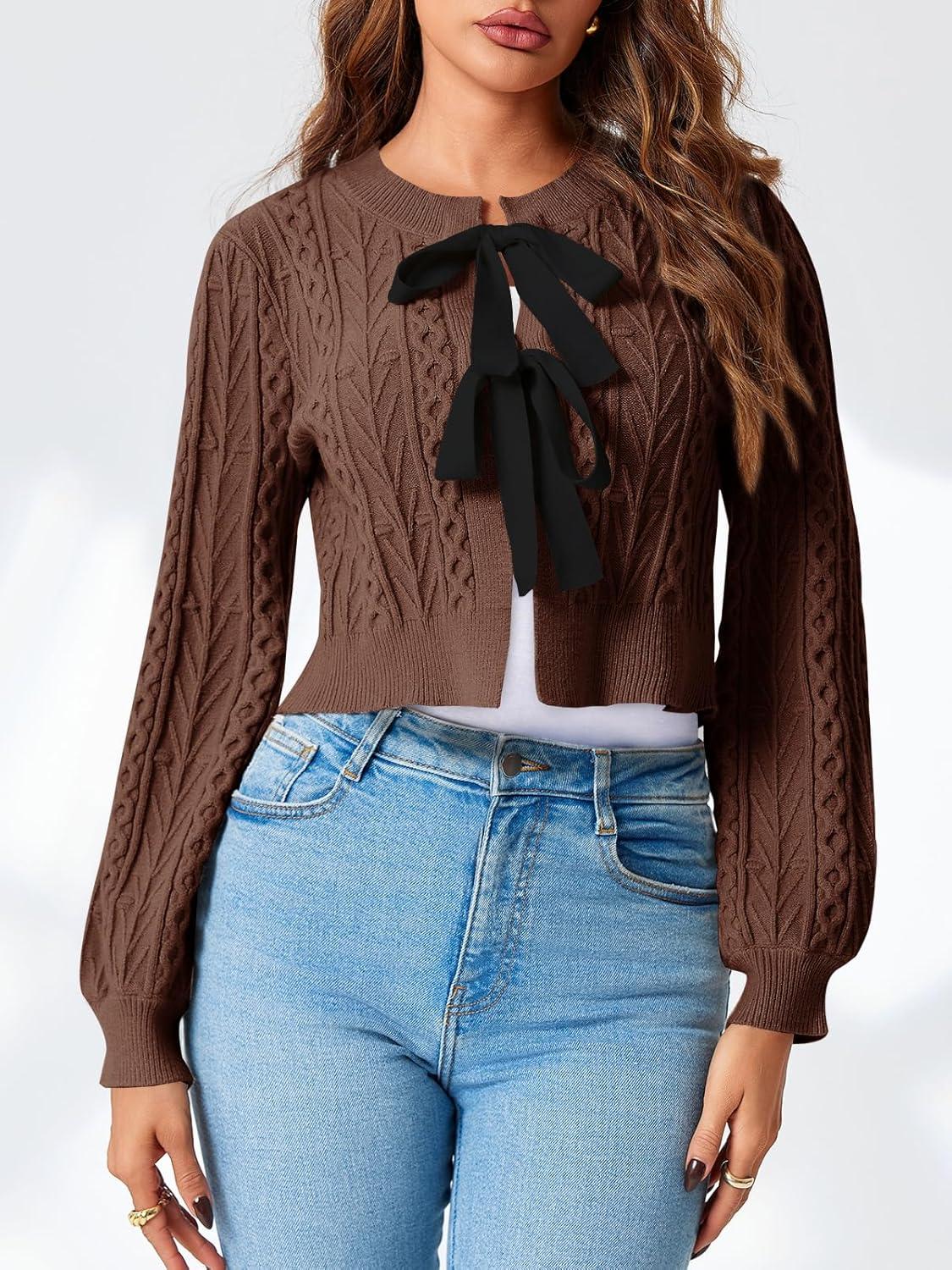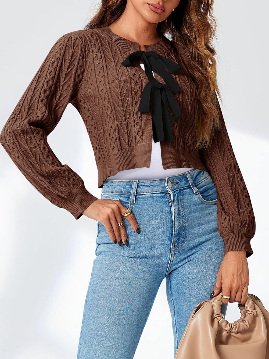 Saodimallsu Womens Cropped Cable Knit Cardigan Sweaters Long Sleeve Bow Tie Front Crew Neck Chunky Sweater Tops(Brown)