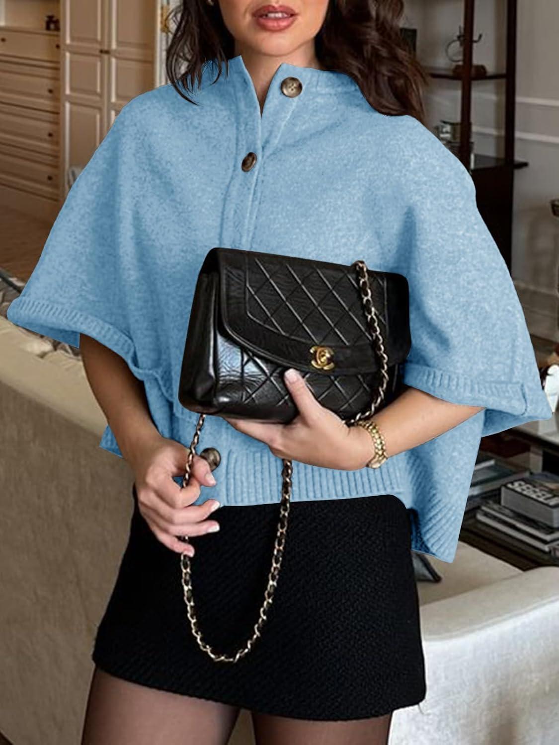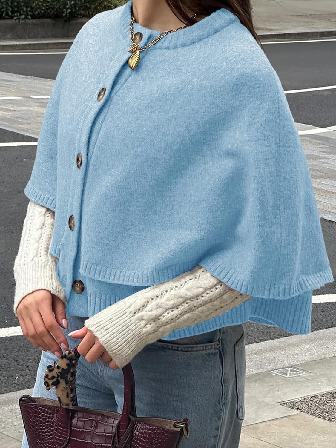 Saodimallsu Womens Cropped Cape Cardigan Button Up Crew Neck Jacket Shawl Fall Trendy Knit Sweater(Sky Blue)