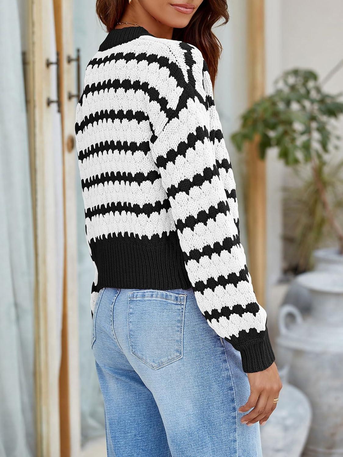 Saodimallsu Womens Cropped Cardigan Striped Open Front Long Lantern Sleeve Color Block Loose Chunky Knit Sweater Coat(White)