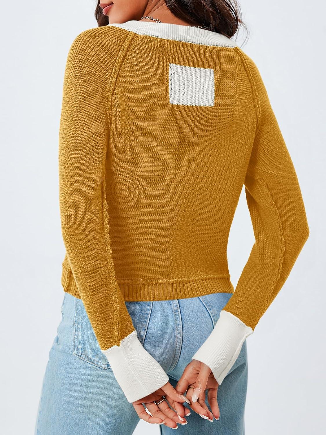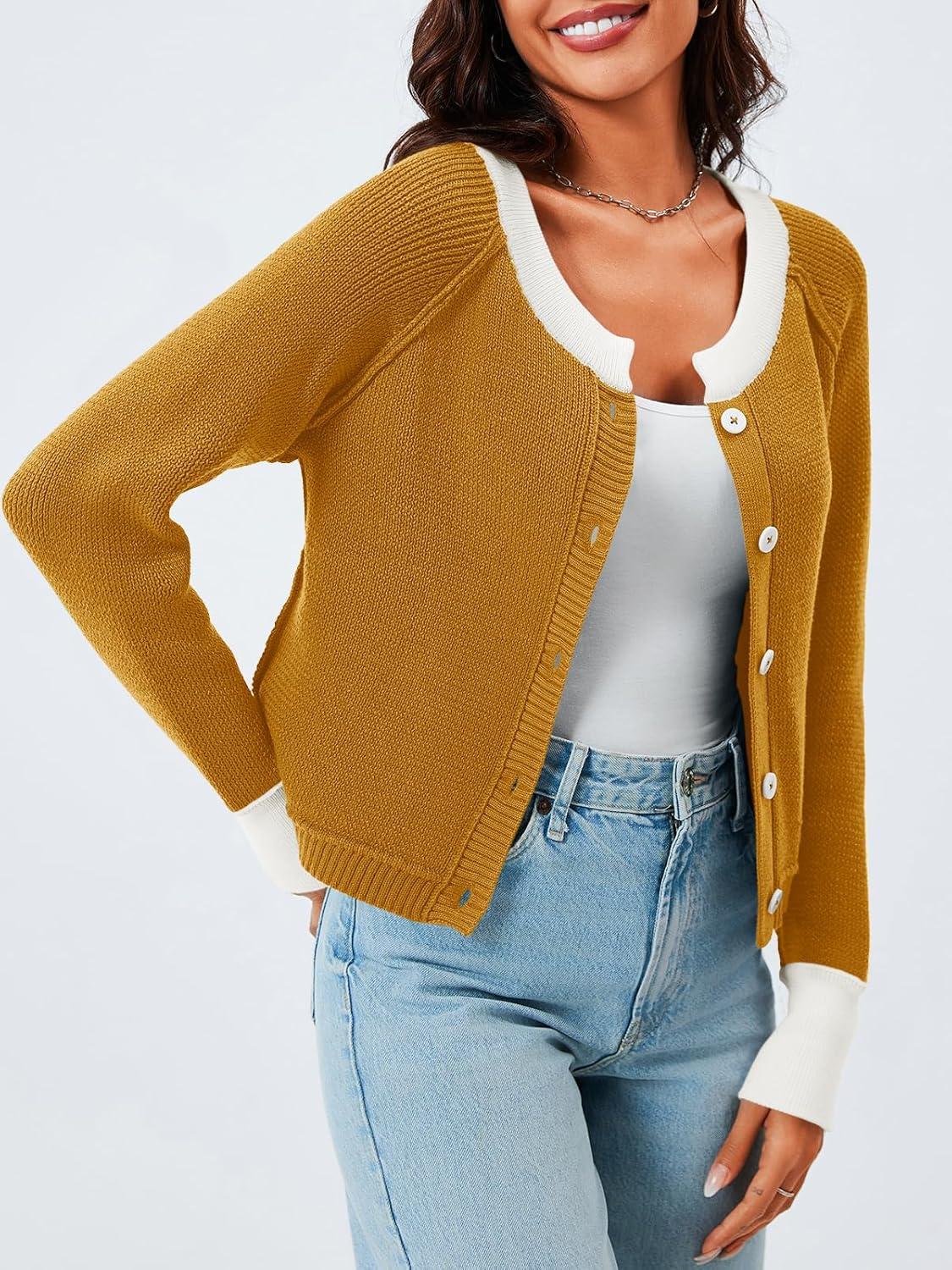 Saodimallsu Womens Cropped Cardigan Sweaters Button Down Open Front Long Sleeve Fall Trendy Color Block Knit Coats(Ginger)