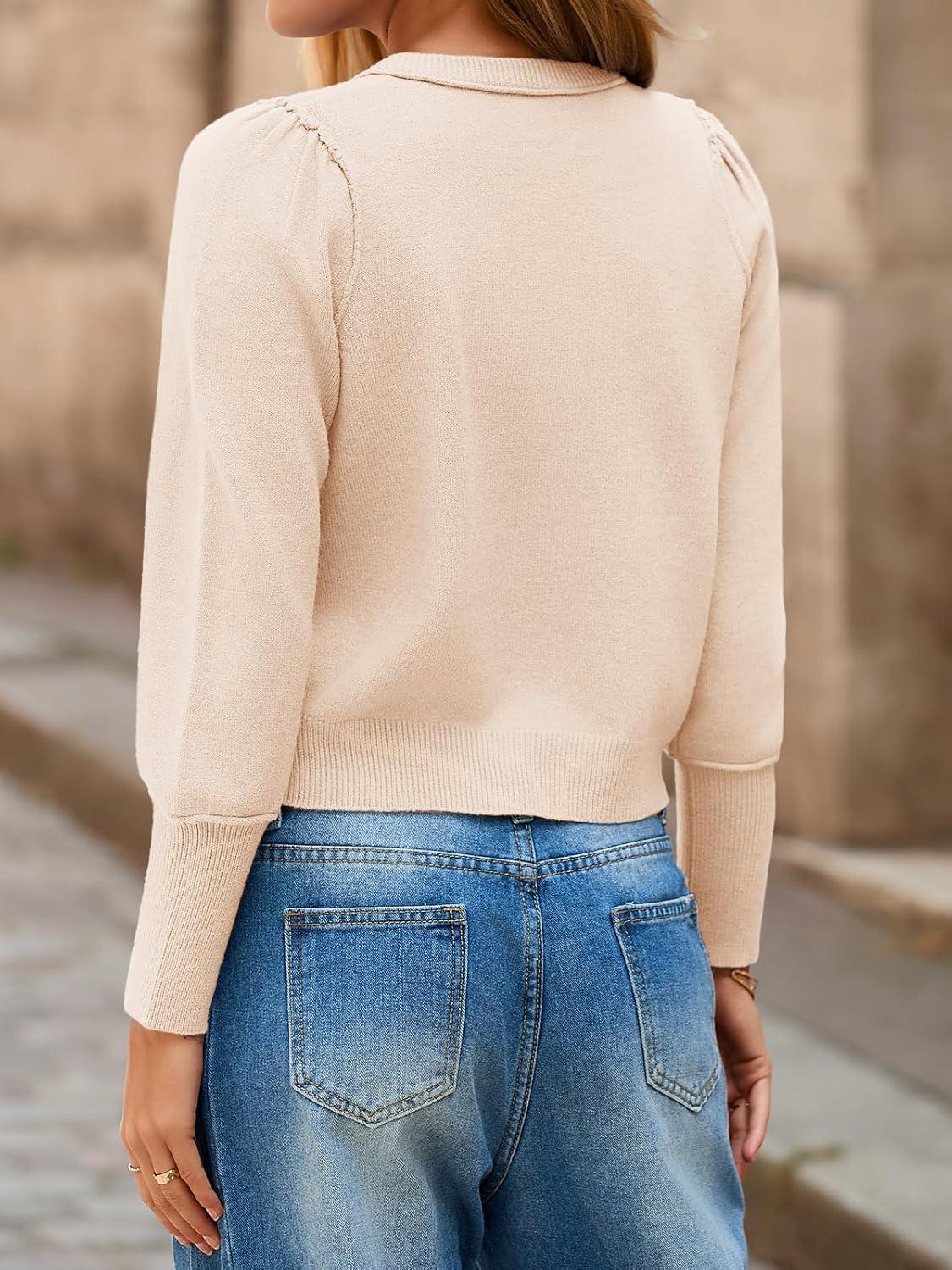 Saodimallsu Womens Cropped Cardigan Sweaters Crew Neck Button Down Long Puff Sleeve Loose Knit Fall Trendy Sweater Tops(Beige)