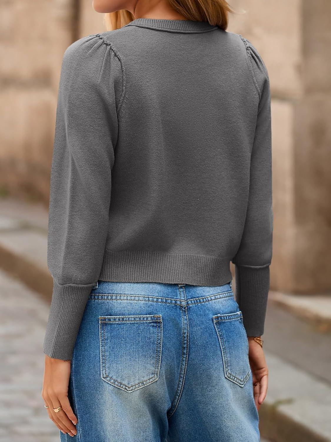Saodimallsu Womens Cropped Cardigan Sweaters Crew Neck Button Down Long Puff Sleeve Loose Knit Fall Trendy Sweater Tops(Gray)