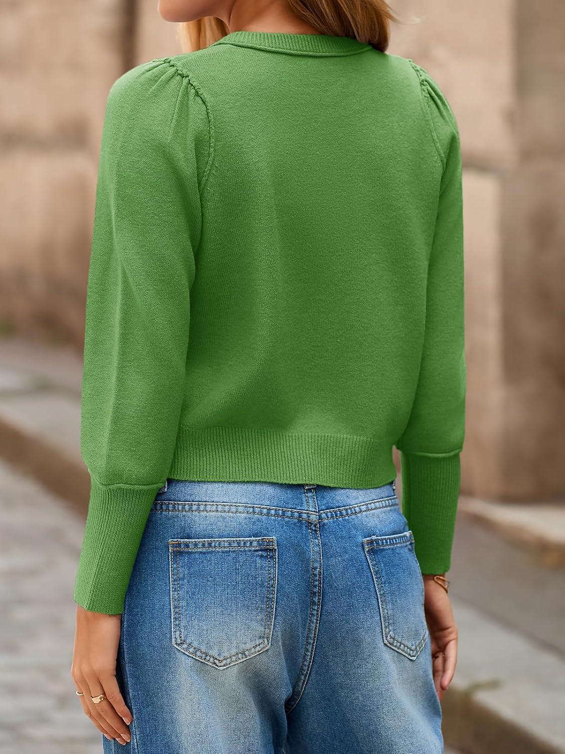 Saodimallsu Womens Cropped Cardigan Sweaters Crew Neck Button Down Long Puff Sleeve Loose Knit Fall Trendy Sweater Tops(Green)