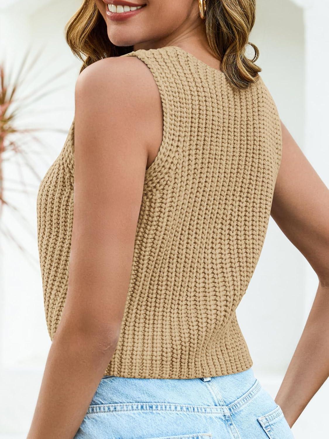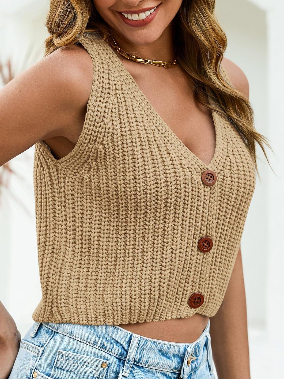 Saodimallsu Womens Cropped Sweater Vest V Neck Button Down Y2k Crop Knit Summer Trendy Sleeveless Chunky Tank Tops(Dark Khaki)