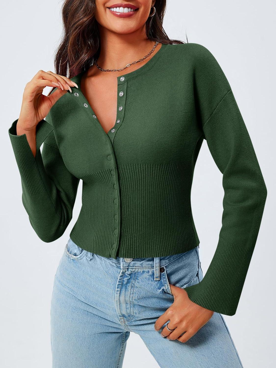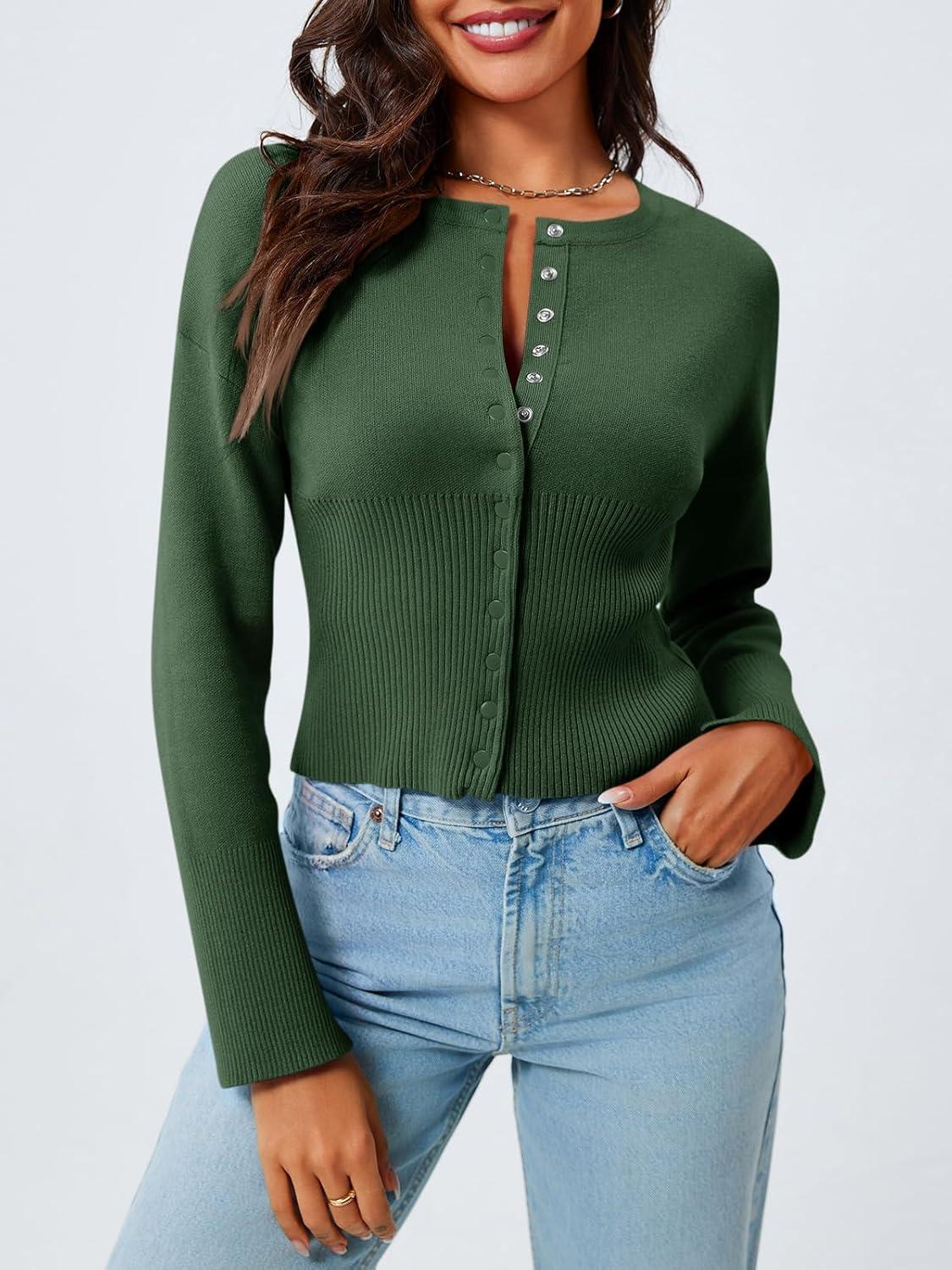 Saodimallsu Womens Cropped Sweaters Button Down Long Sleeve V Neck Ribbed Knit Slim Fit Pullover Crop Tops(Army Green)