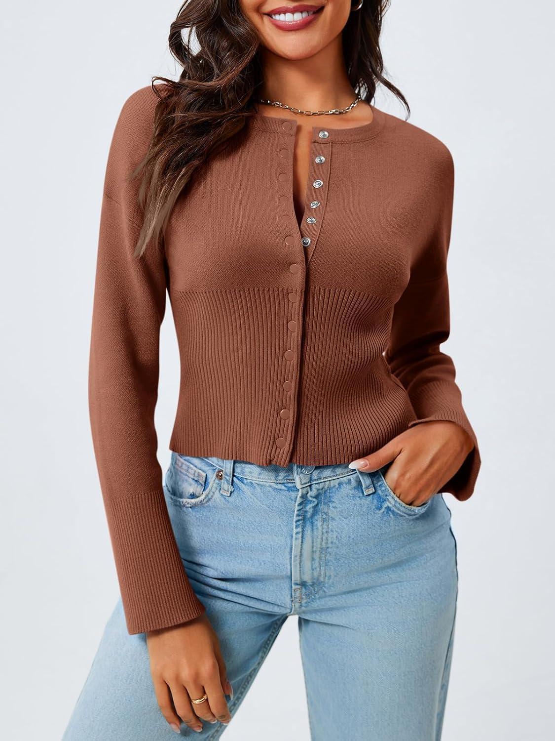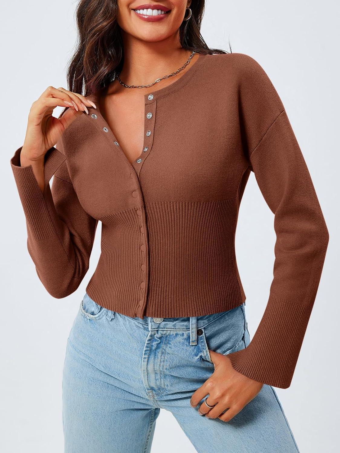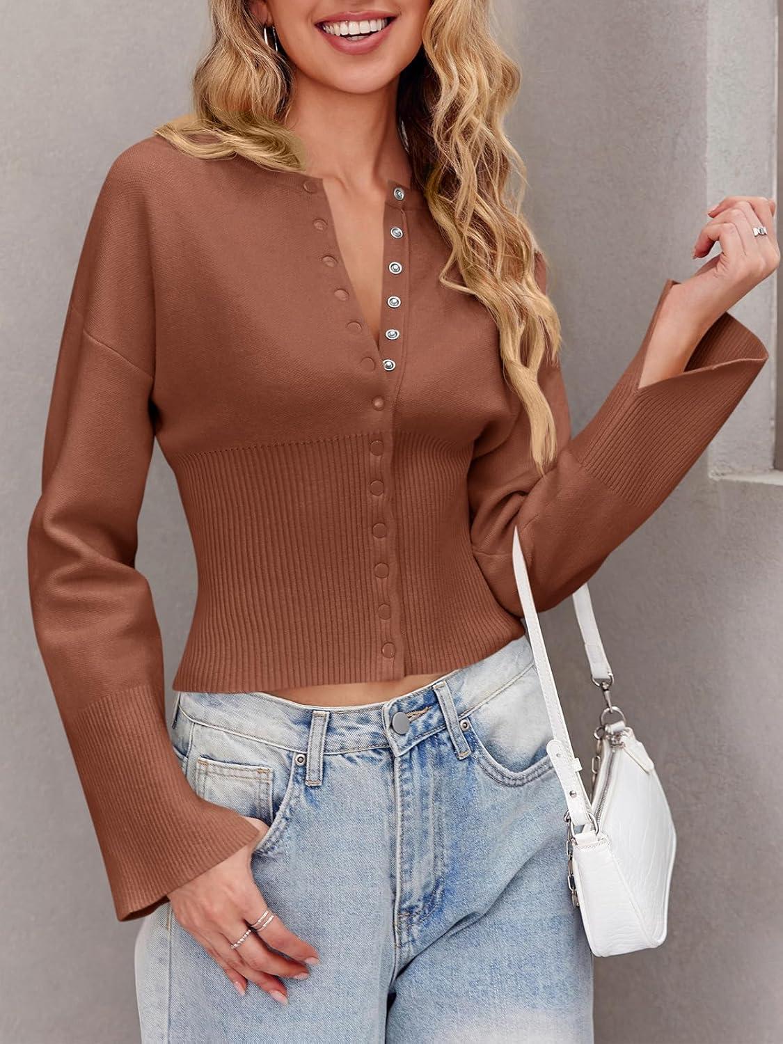 Saodimallsu Womens Cropped Sweaters Button Down Long Sleeve V Neck Ribbed Knit Slim Fit Pullover Crop Tops(Brick Red)
