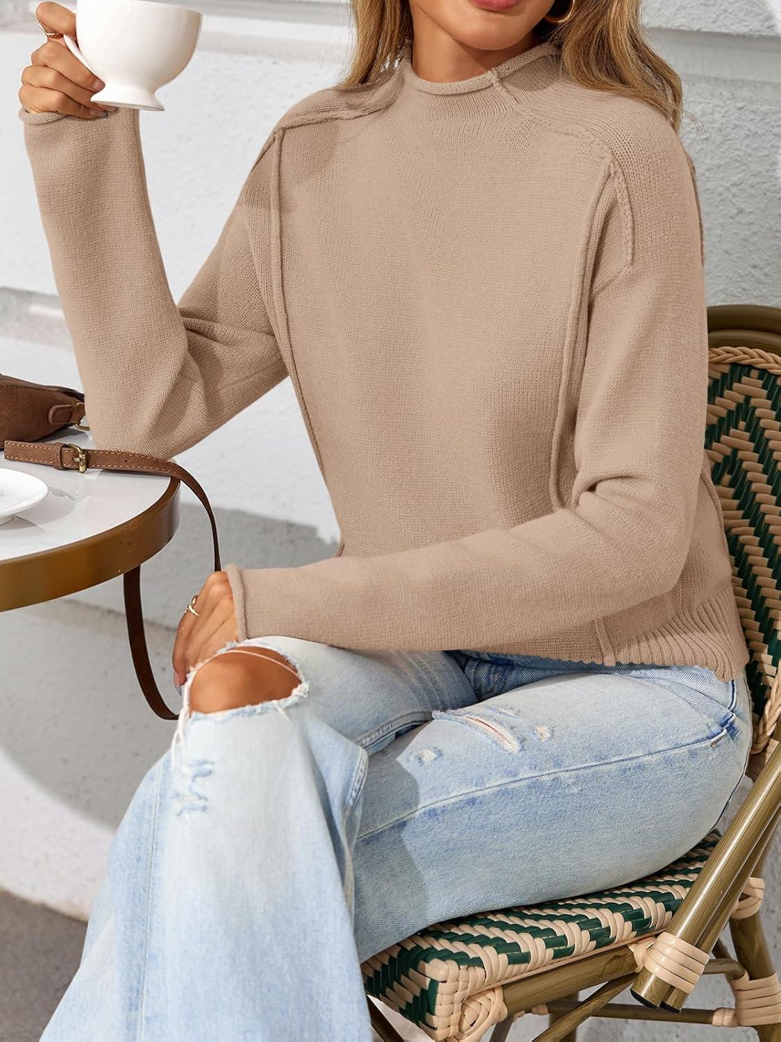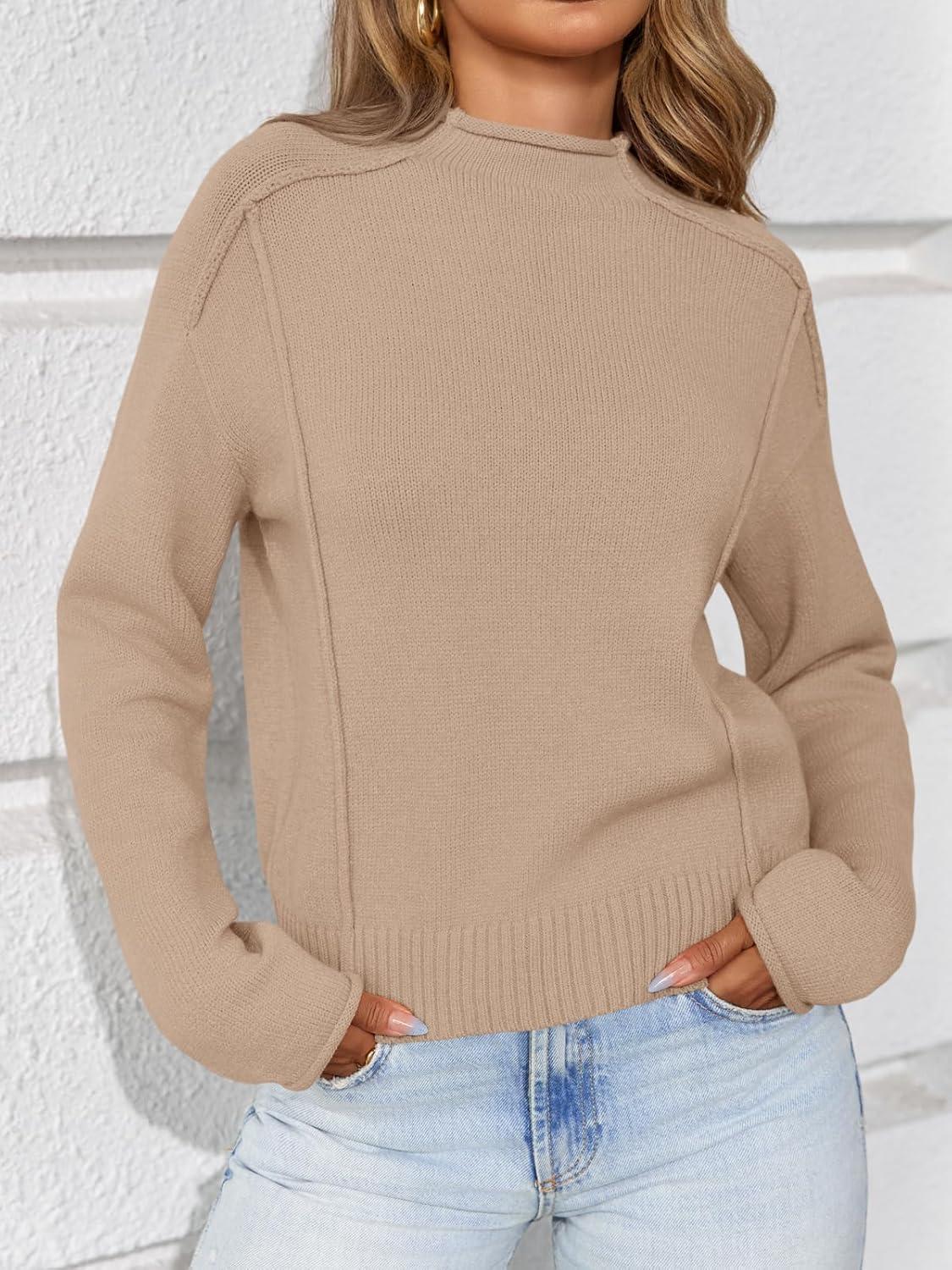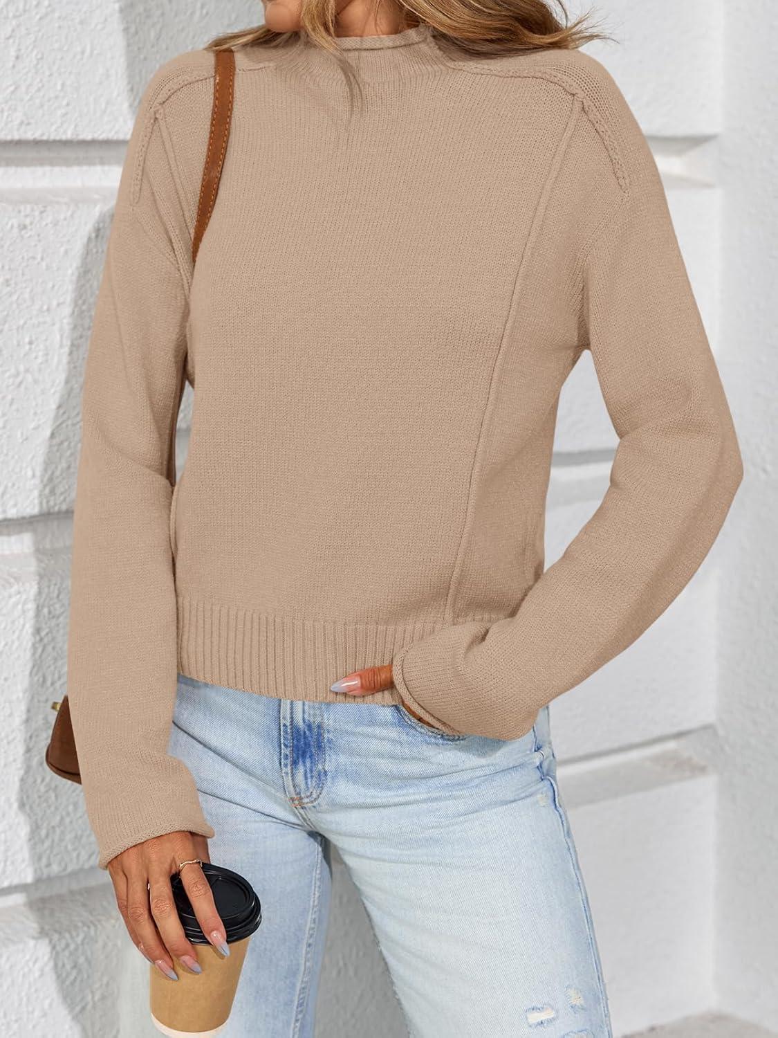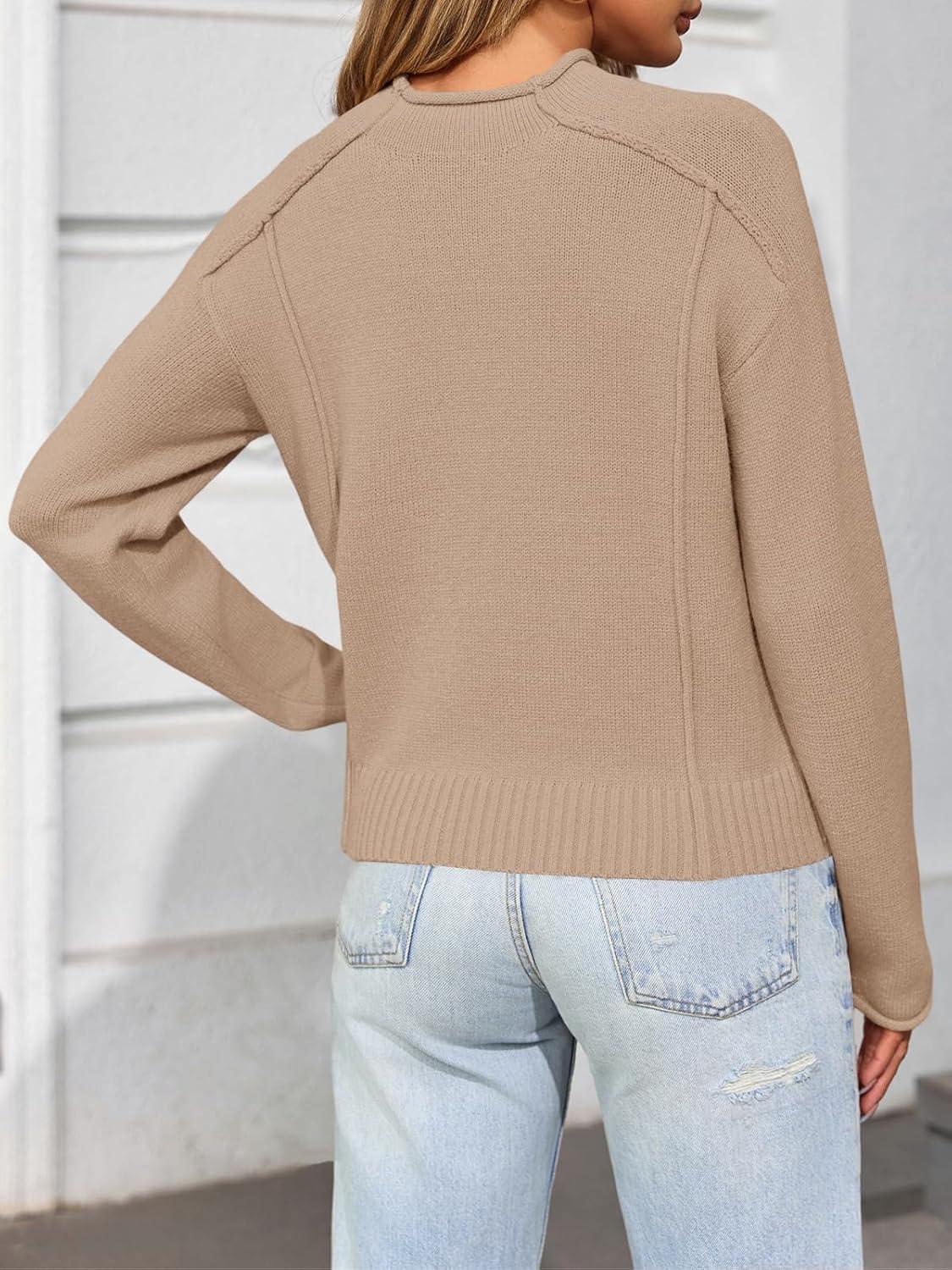 Saodimallsu Womens Cropped Sweaters Long Sleeve Mock Neck Soft Knit Casual Loose Fit Fall Pullover Sweater Tops(Khaki)