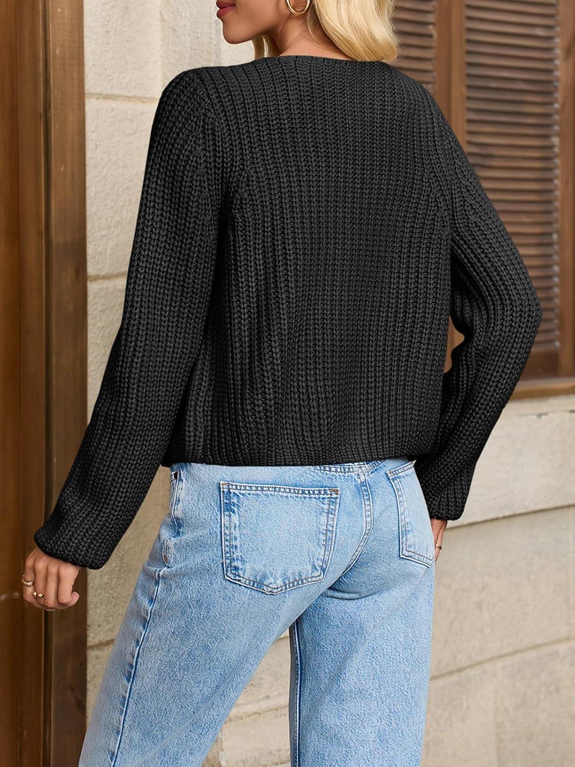 Saodimallsu Womens Cropped V Neck Cardigan Sweaters Long Sleeve Button Down Chunky Ribbed Knit Loose Crop Sweater Tops(Black)
