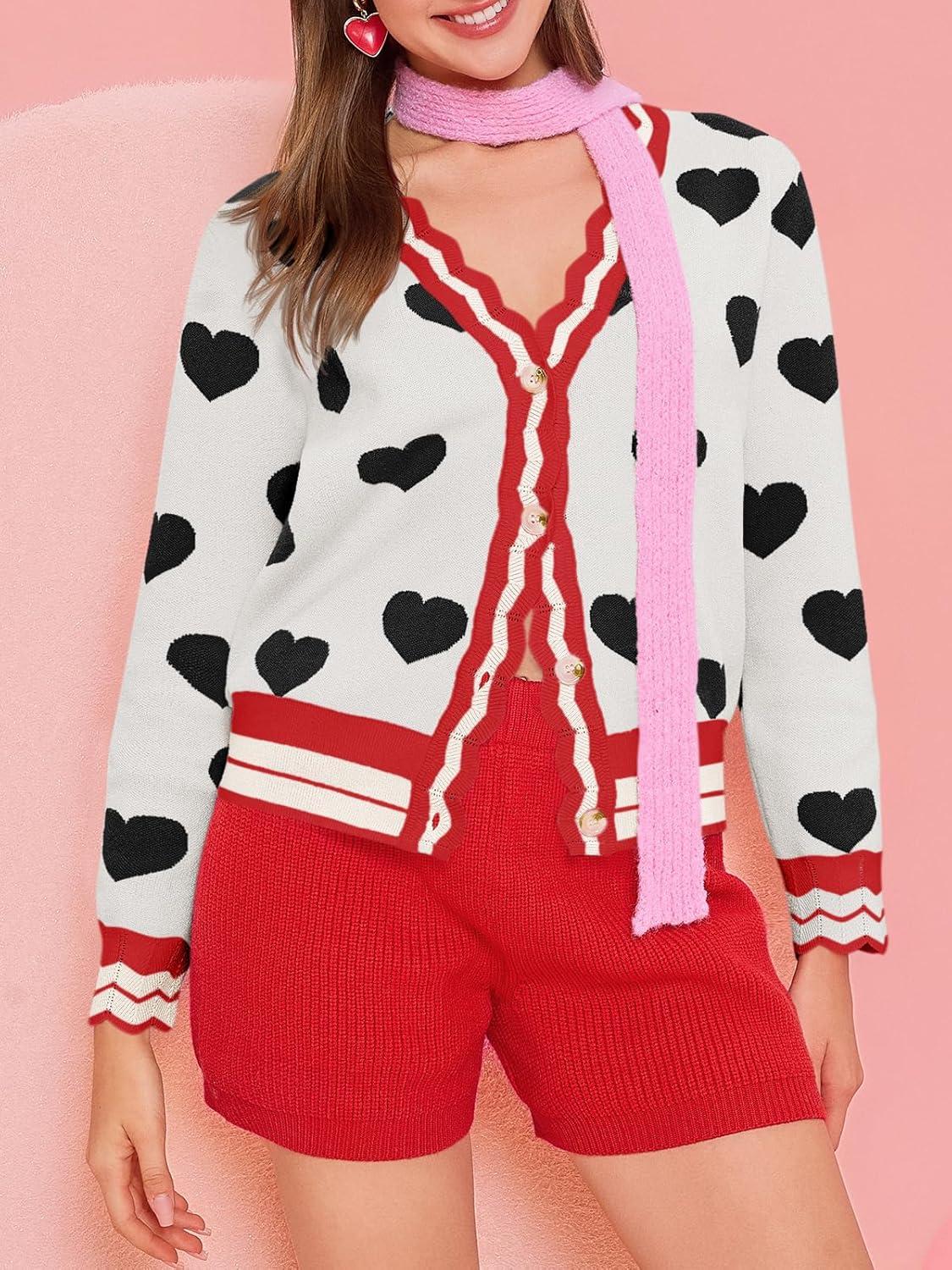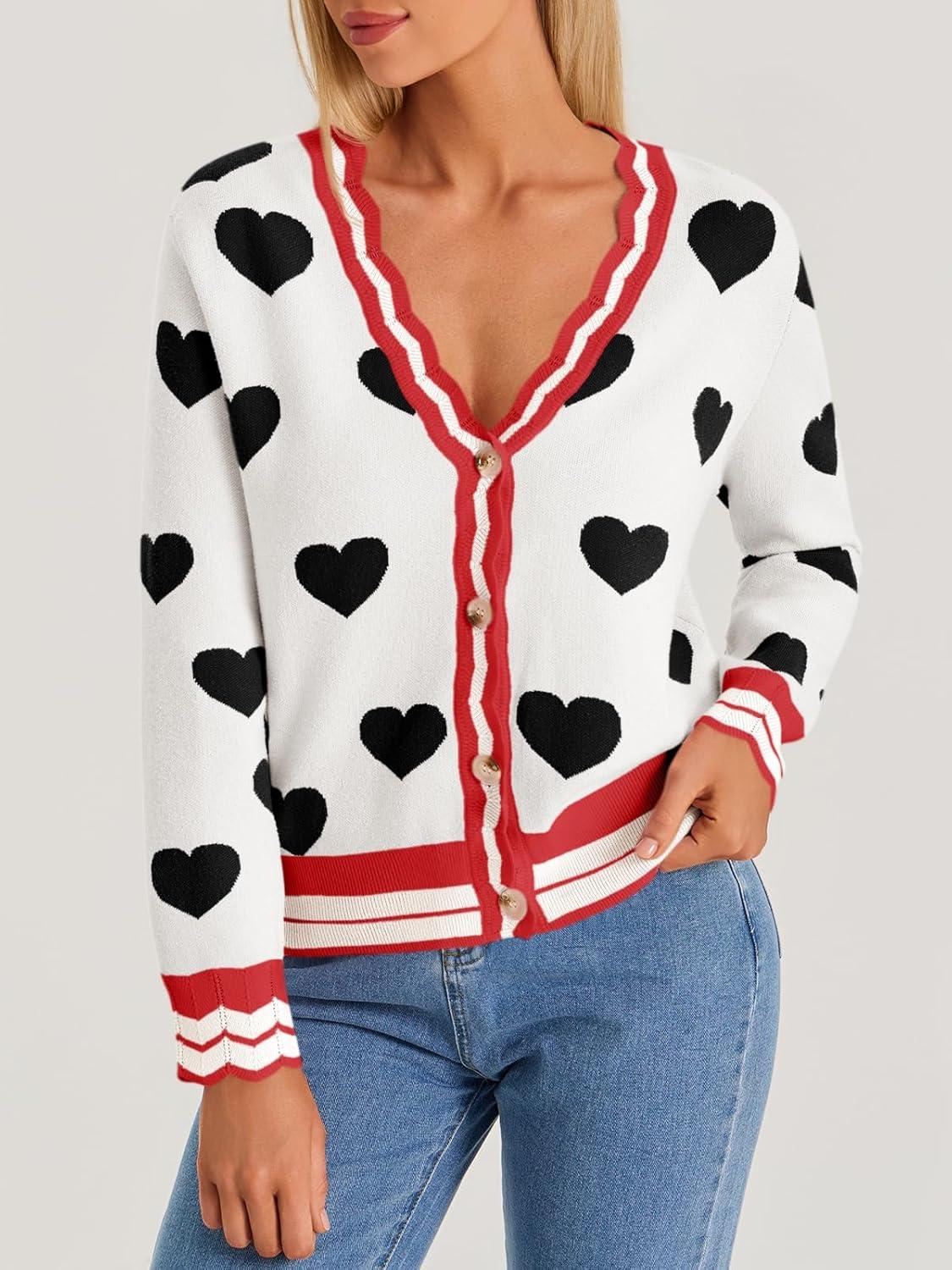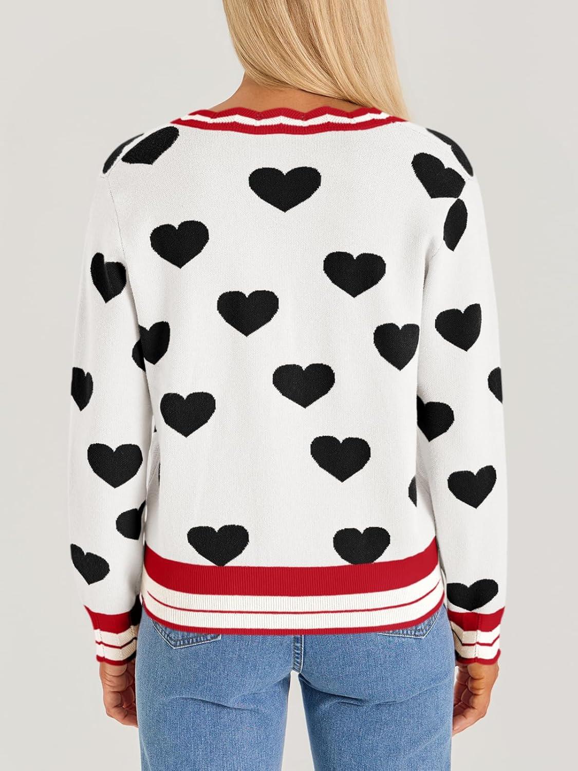 Saodimallsu Womens Cute Heart Cardigan Sweaters Button V Neck Long Sleeve Color Block Knit Valentines Sweater(White&black)