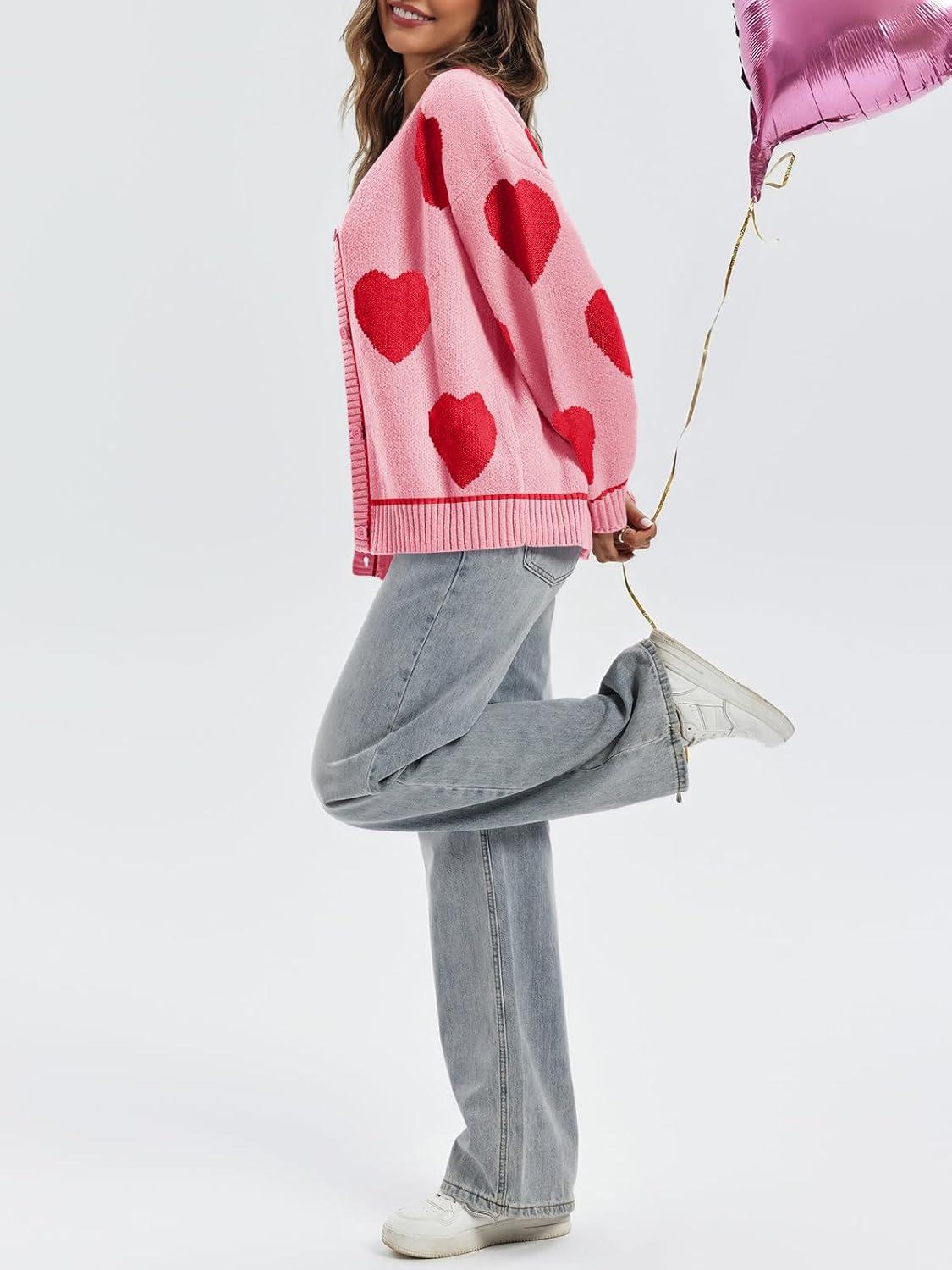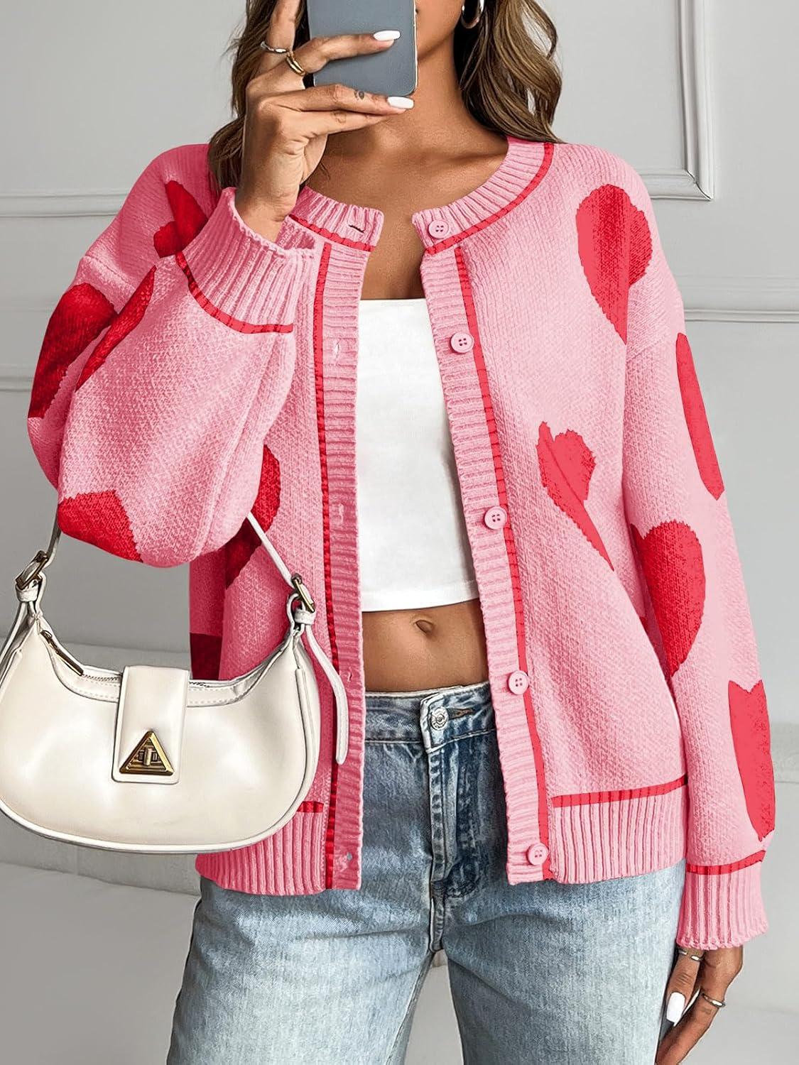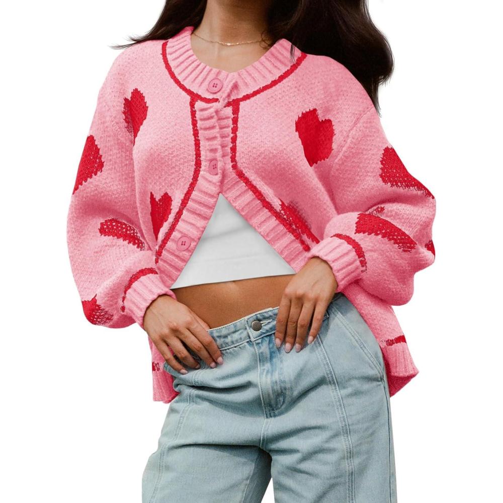 Saodimallsu Womens Cute Heart Cardigan Sweaters Chunky Knit Button Down Crewneck Long Sleeve Sweater Coat(Pink)