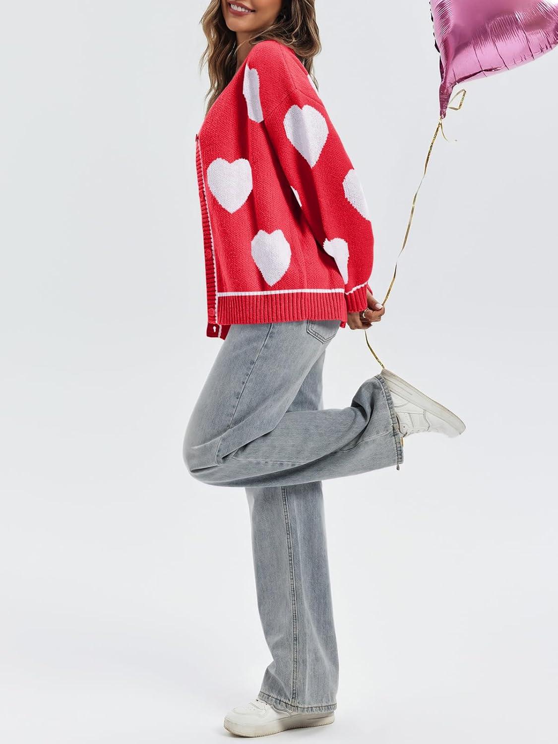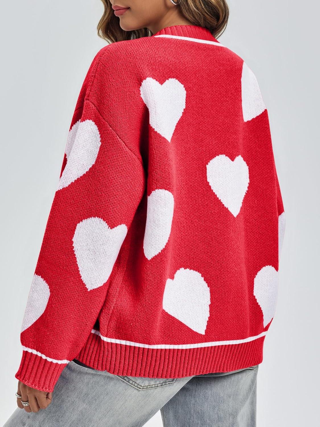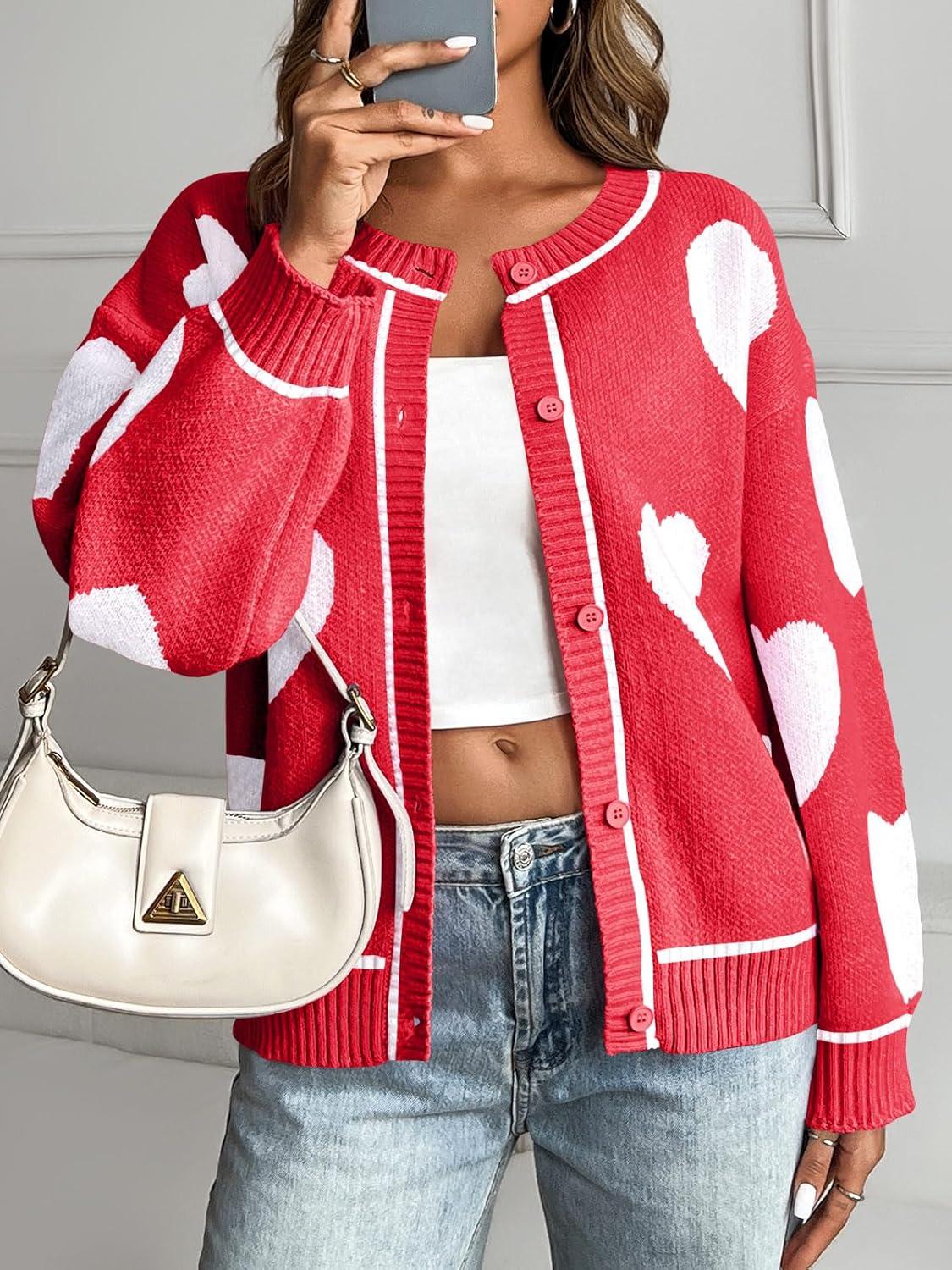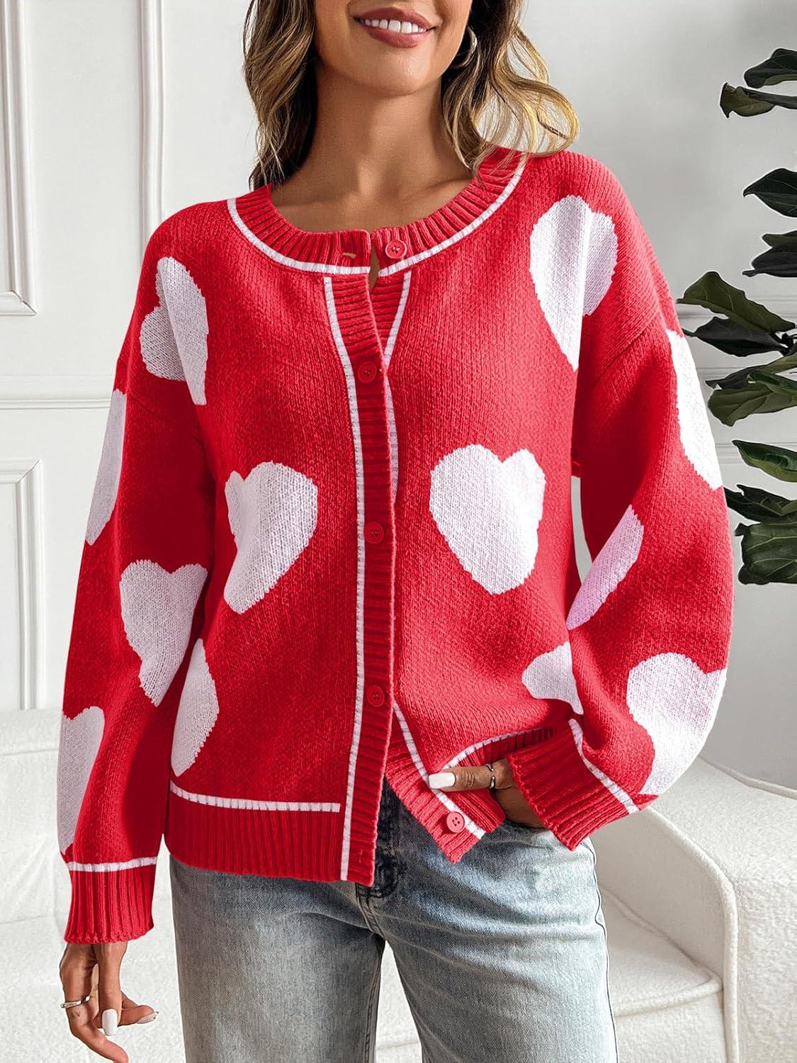 Saodimallsu Womens Cute Heart Cardigan Sweaters Chunky Knit Button Down Crewneck Long Sleeve Sweater Coat(Red)