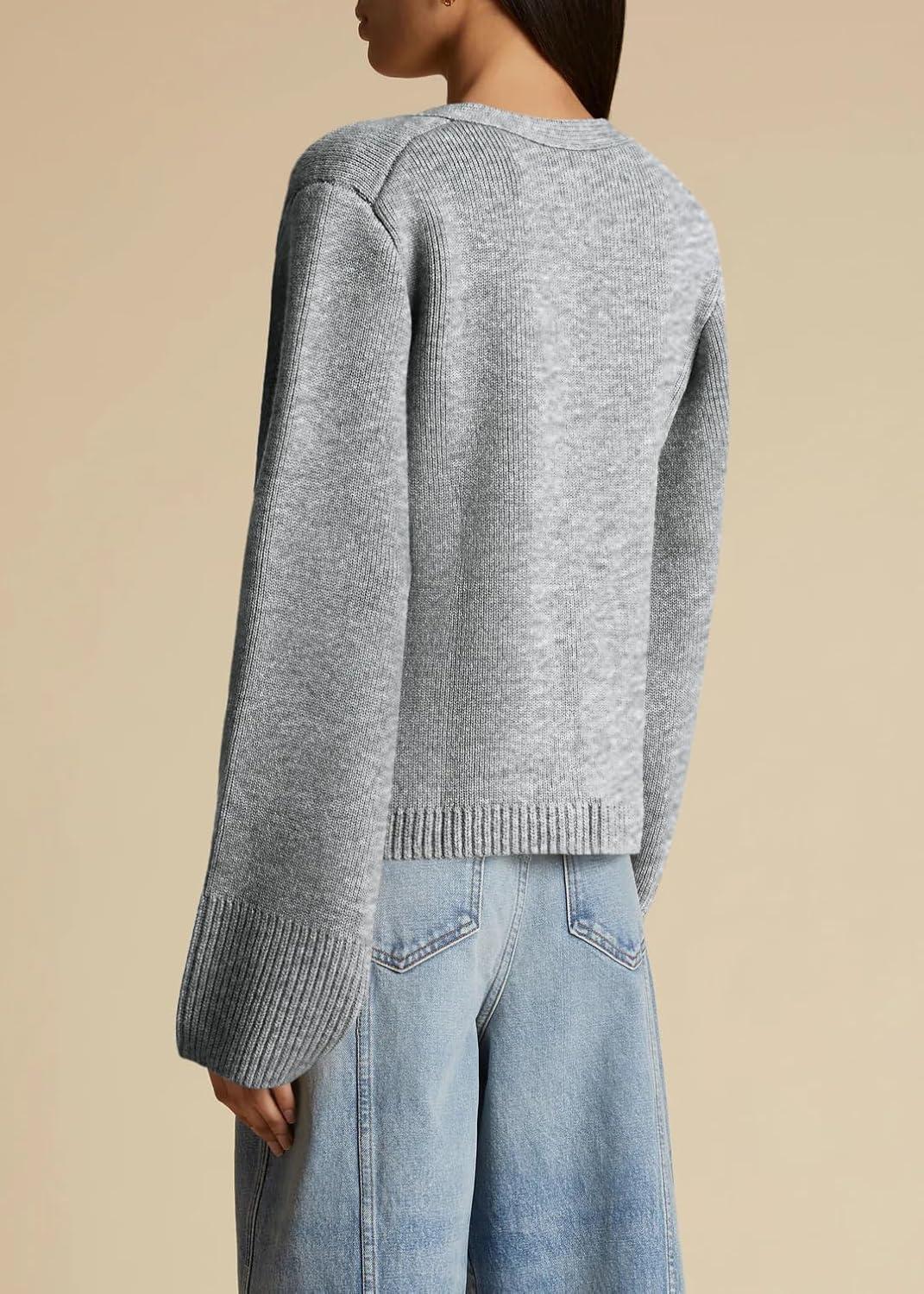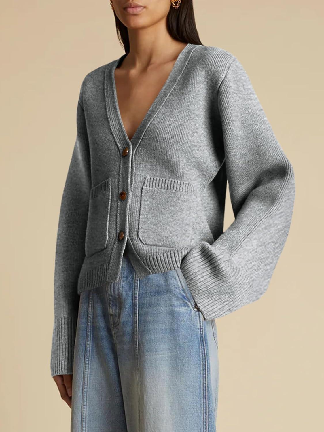 Saodimallsu Womens Deep V Neck Cardigan Sweaters Open Front Button Down Long Sleeve Cropped Knit Coats with Pockets(Grey)