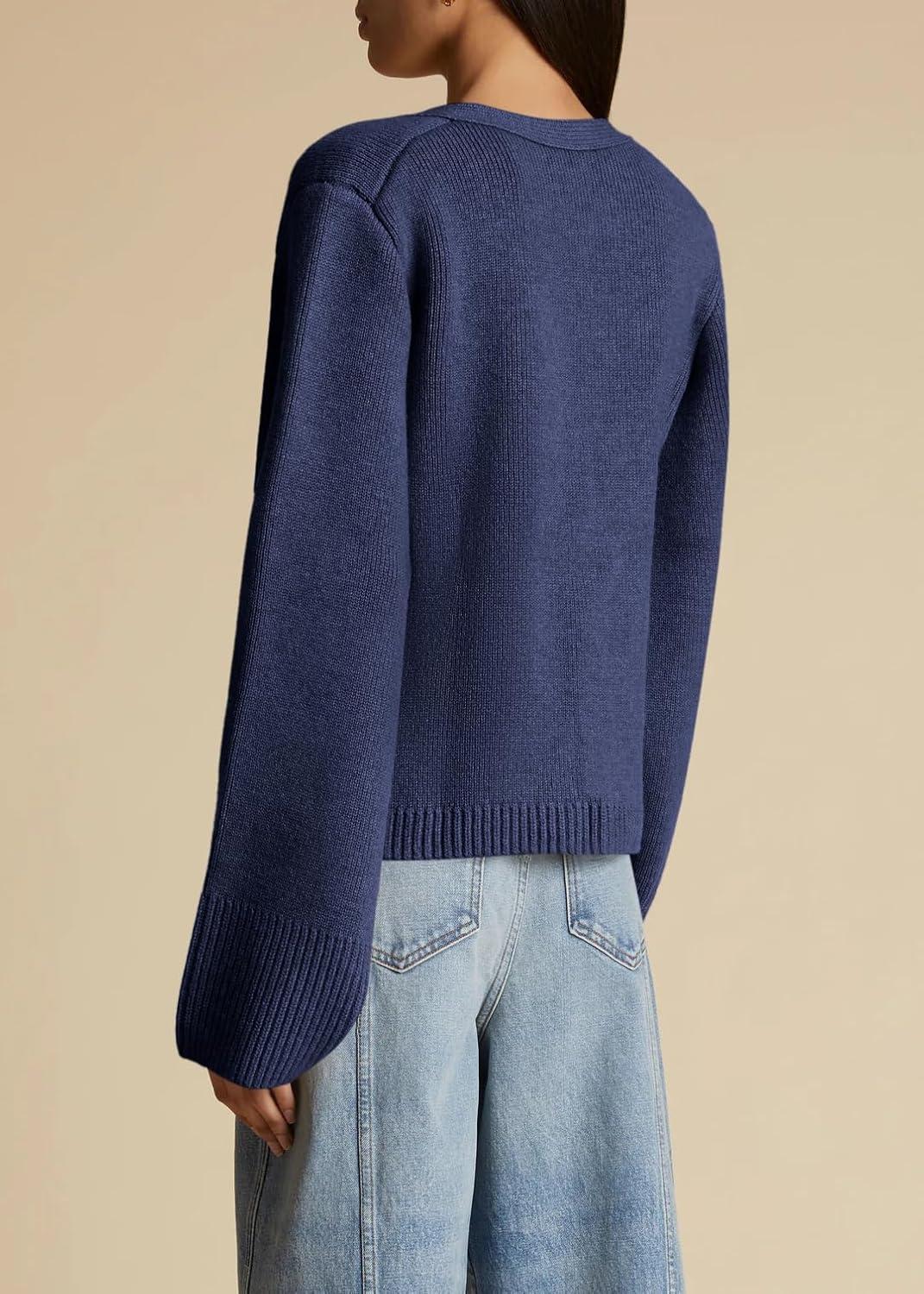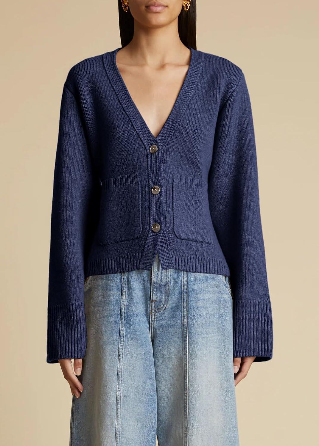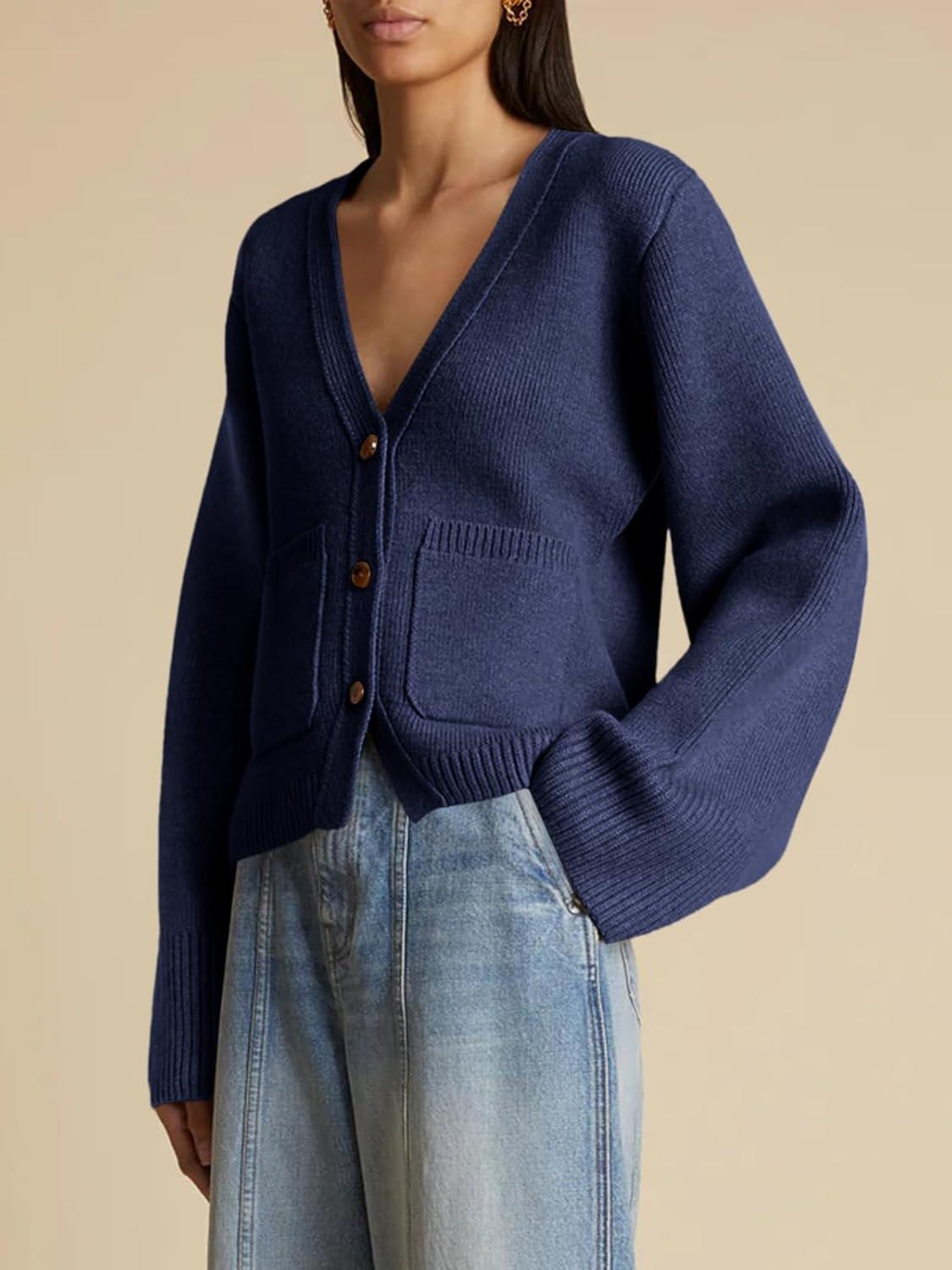 Saodimallsu Womens Deep V Neck Cardigan Sweaters Open Front Button Down Long Sleeve Cropped Knit Coats with Pockets(Navy)