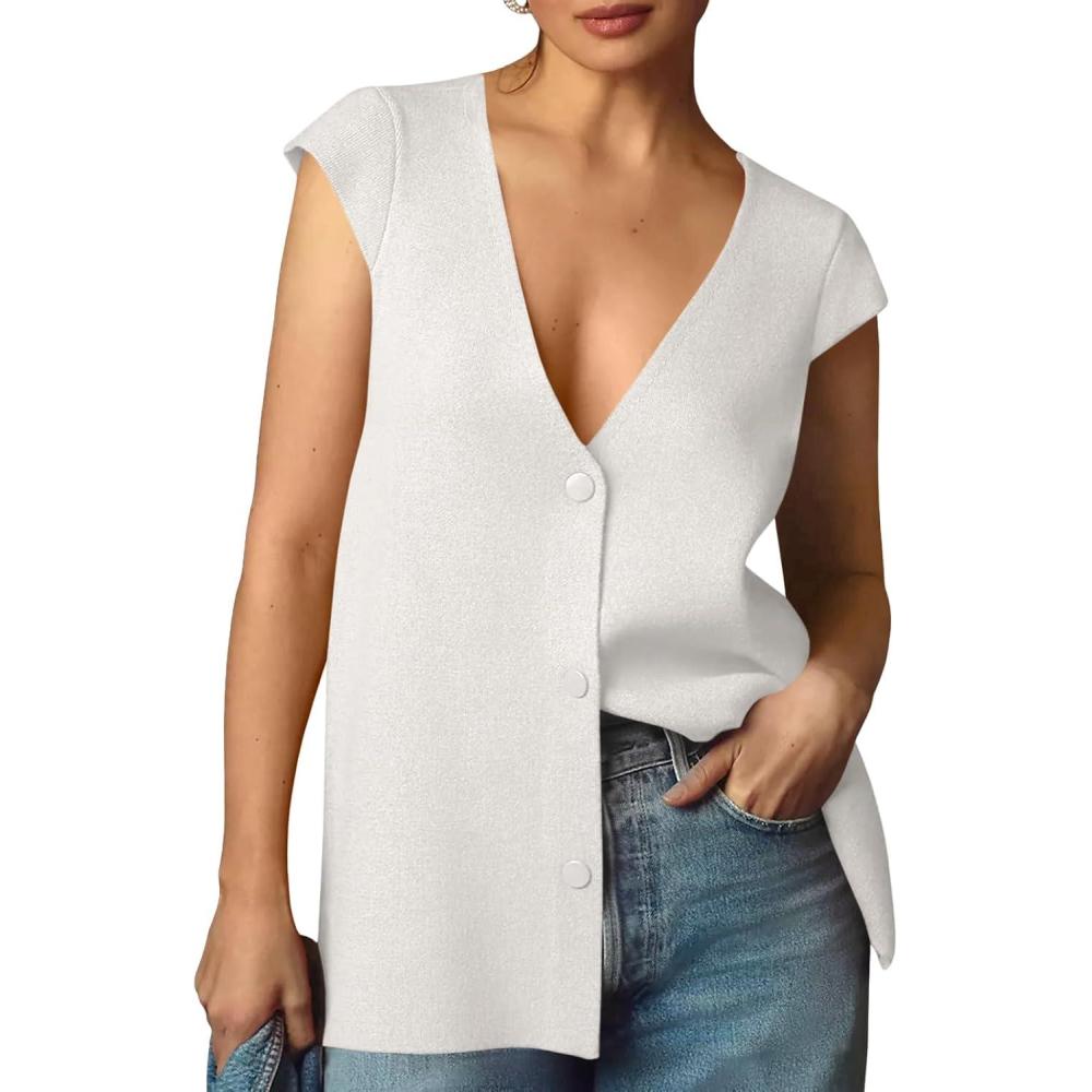 Saodimallsu Womens Deep V Neck Sweater Vest Sleeveless Knit Button Up Loose Fit Cap Sleeve Trendy Summer Tops(White)