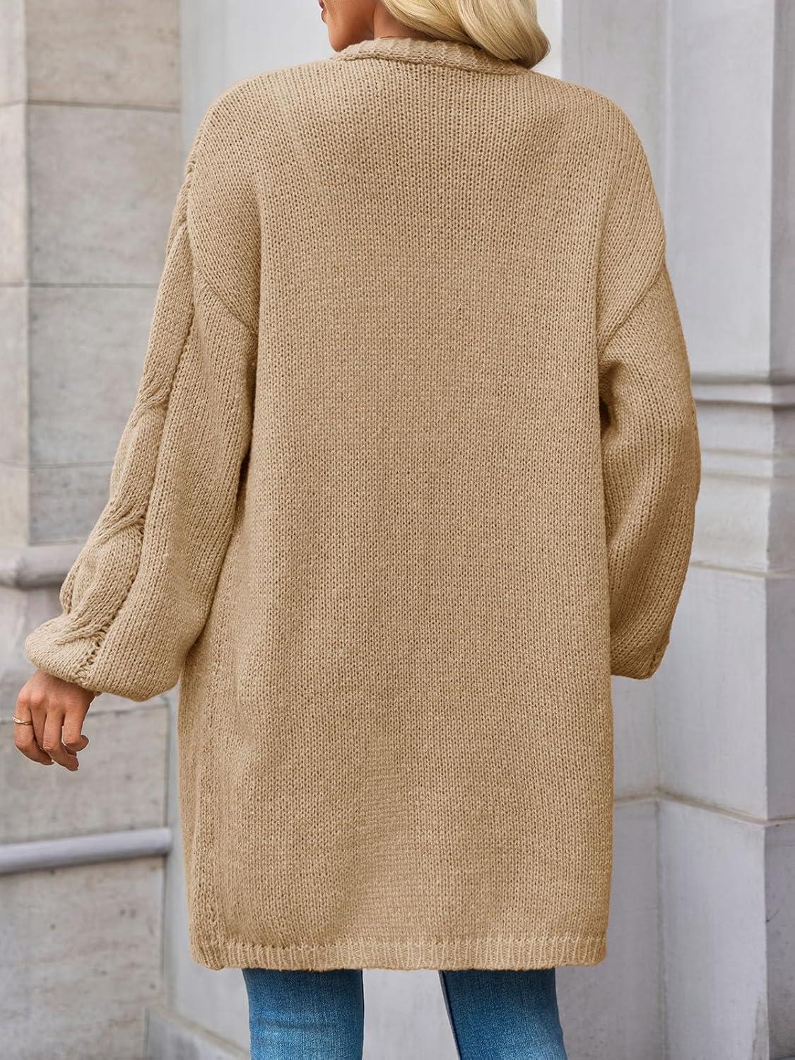Saodimallsu Womens Fall Cable Long Cardigans Lantern Sleeve Knit Open Front Chunky Loose Fit Sweater Coats(Khaki)