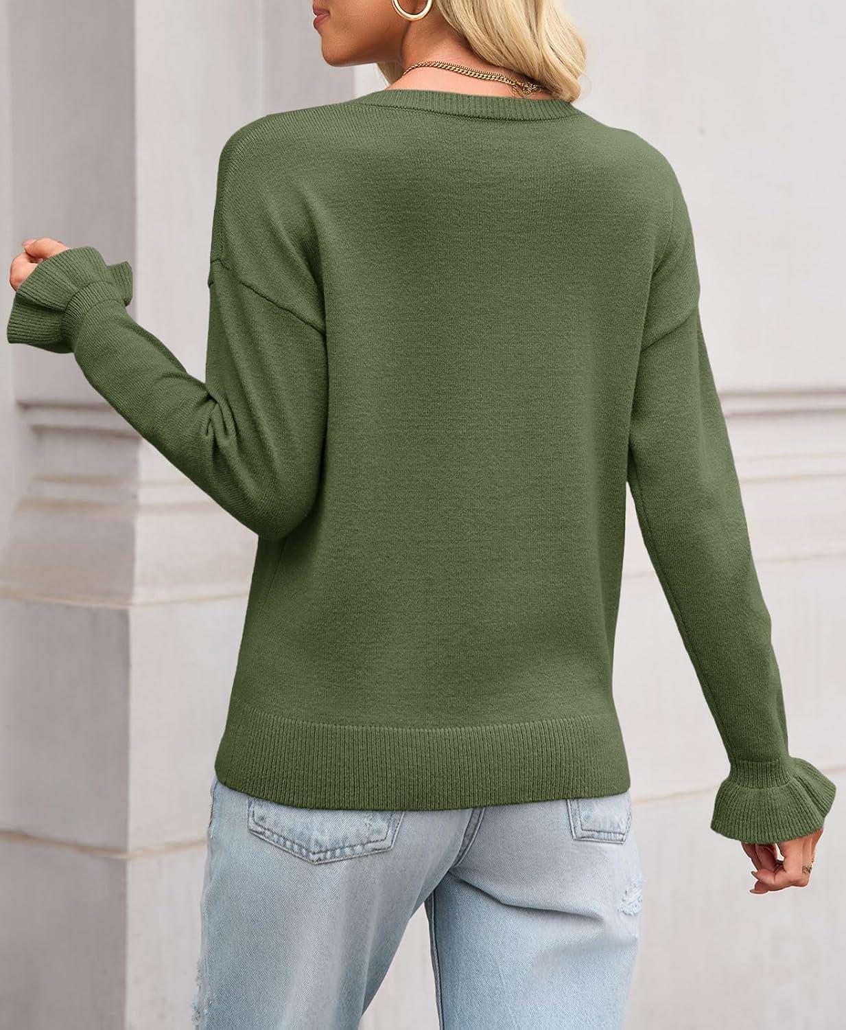 Saodimallsu Womens Fall Crew Neck Sweaters Ruffle Long Sleeve Lightweight Soft Knit Casual Pullover Top(Army Green)