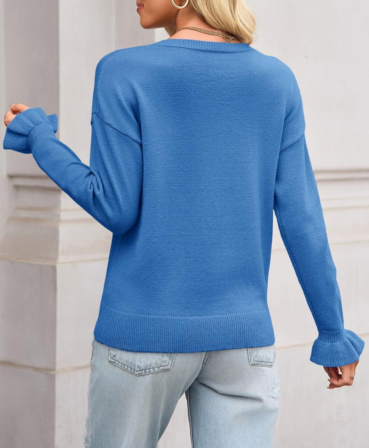 Saodimallsu Womens Fall Crew Neck Sweaters Ruffle Long Sleeve Lightweight Soft Knit Casual Pullover Top(Blue)