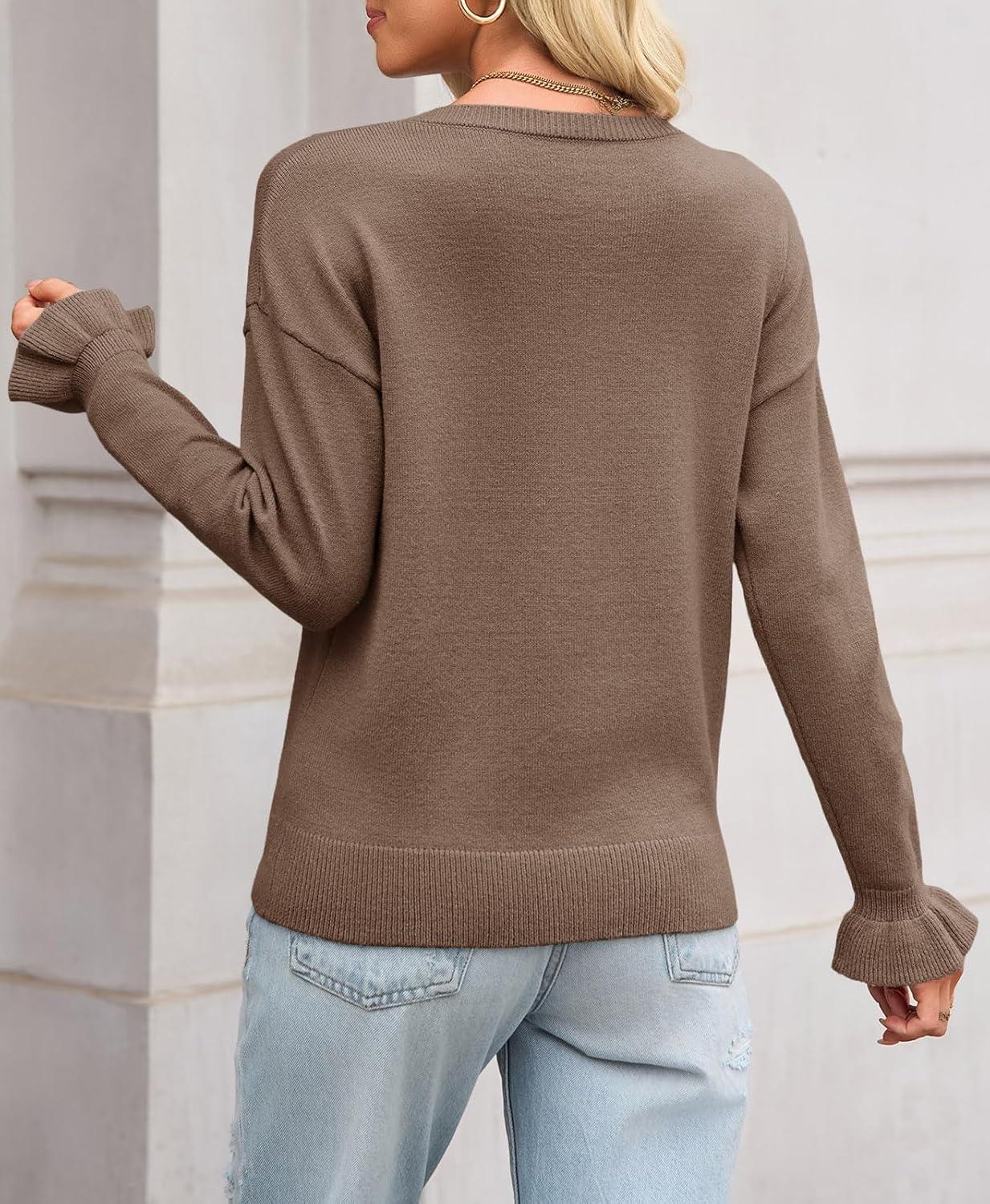 Saodimallsu Womens Fall Crew Neck Sweaters Ruffle Long Sleeve Lightweight Soft Knit Casual Pullover Top(Dark Khaki)