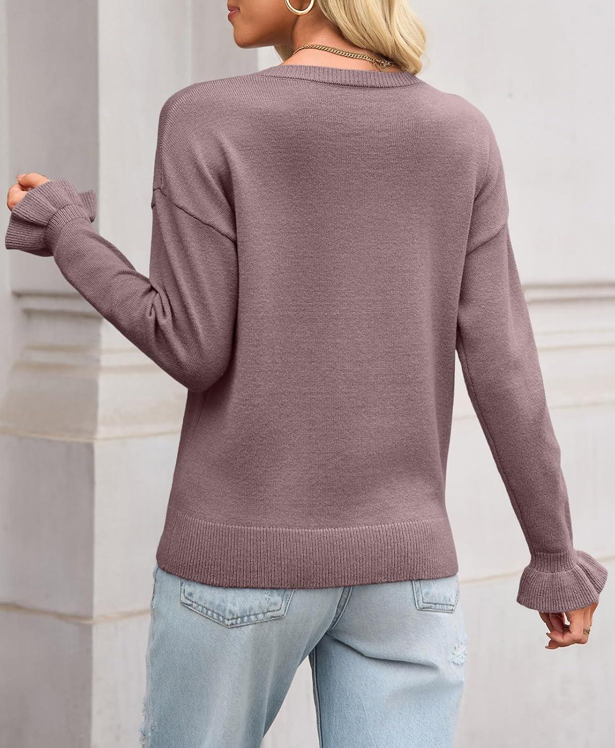 Saodimallsu Womens Fall Crew Neck Sweaters Ruffle Long Sleeve Lightweight Soft Knit Casual Pullover Top(Khaki)