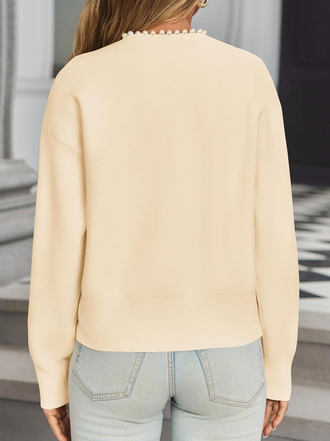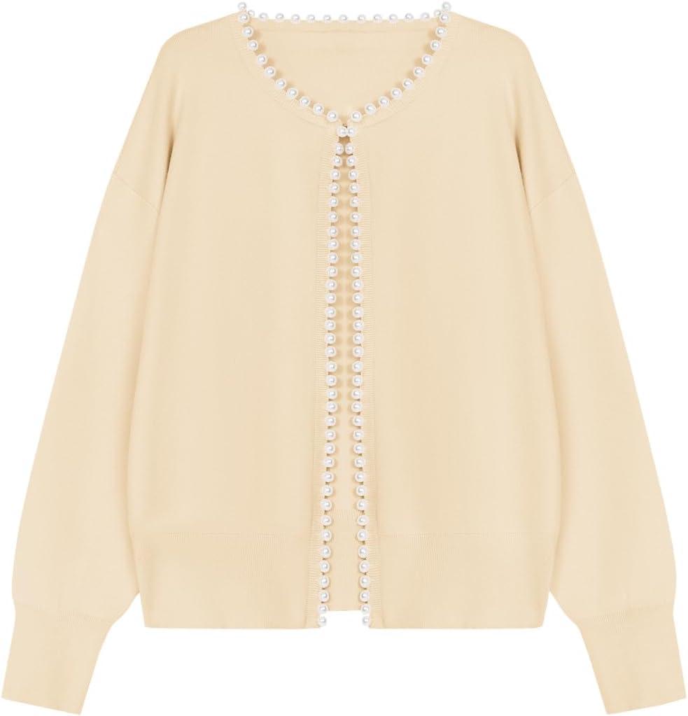 Saodimallsu Womens Fall Open Front Cardigan Sweaters Pearl Long Sleeve Knit Tops Crewneck Dressy Casual Sweater Jacket(Beige)