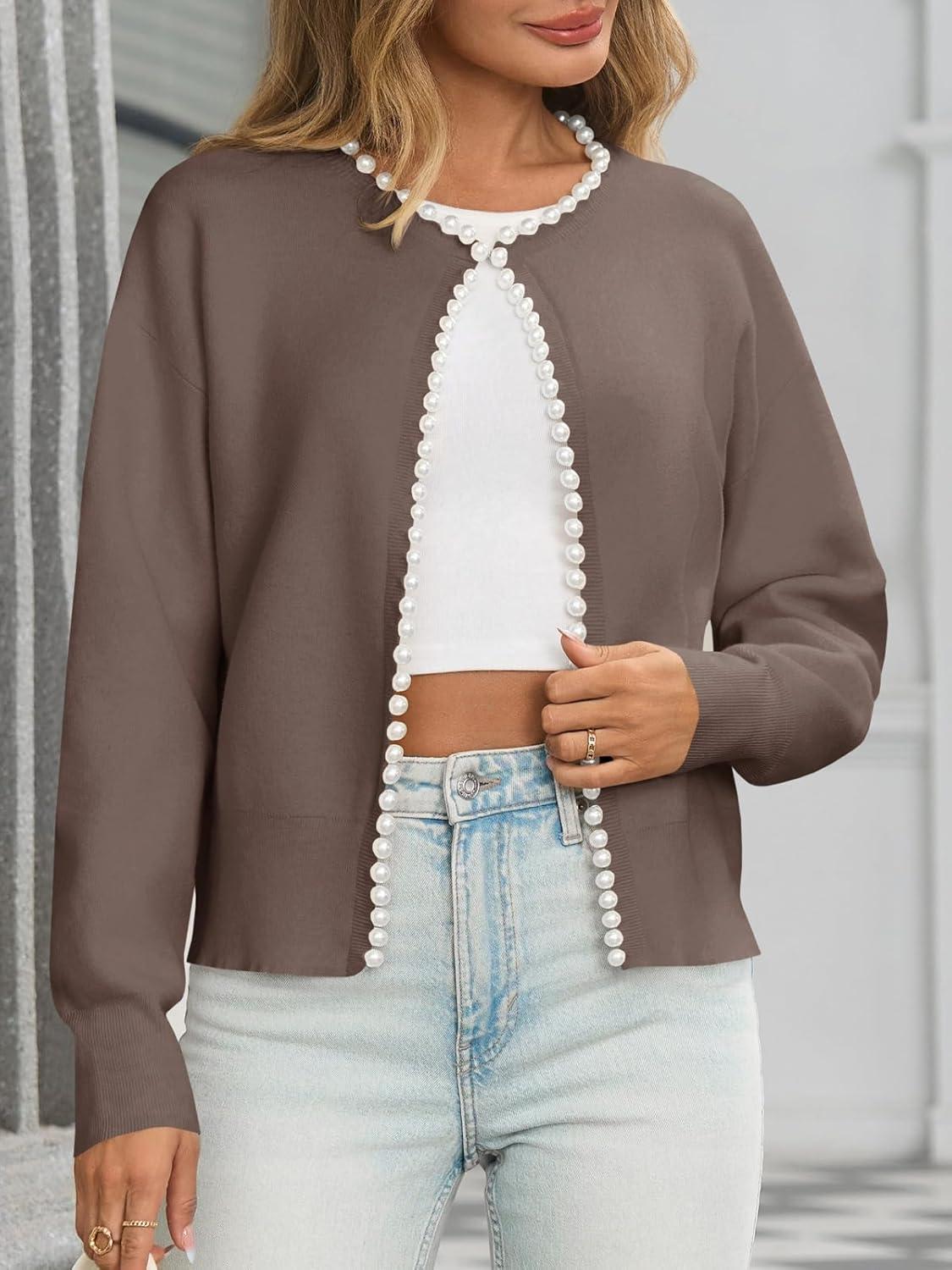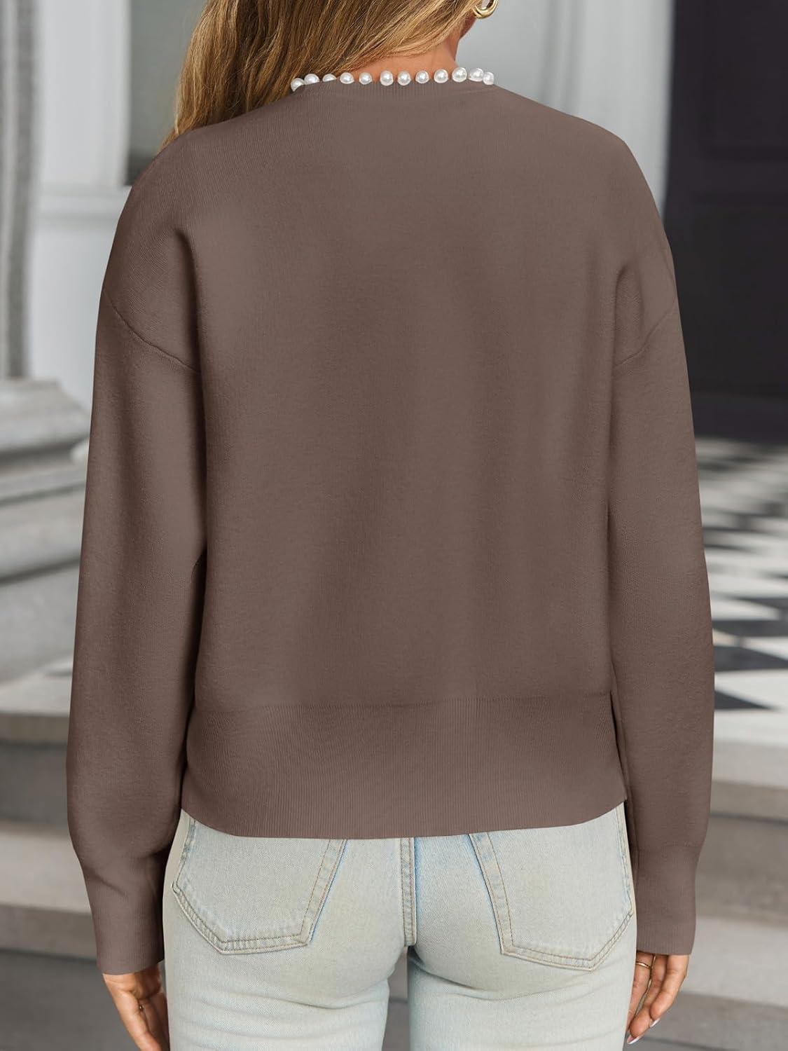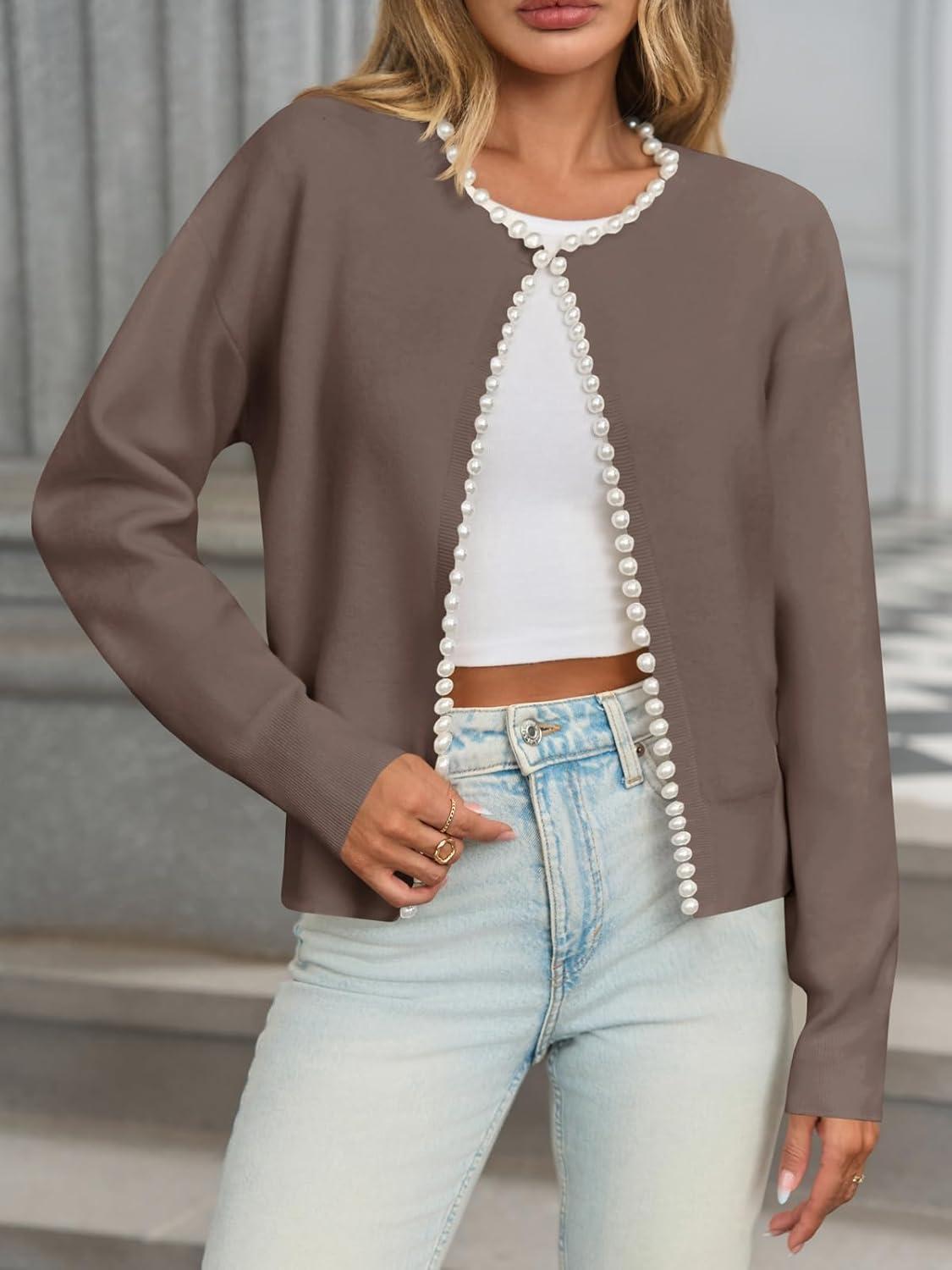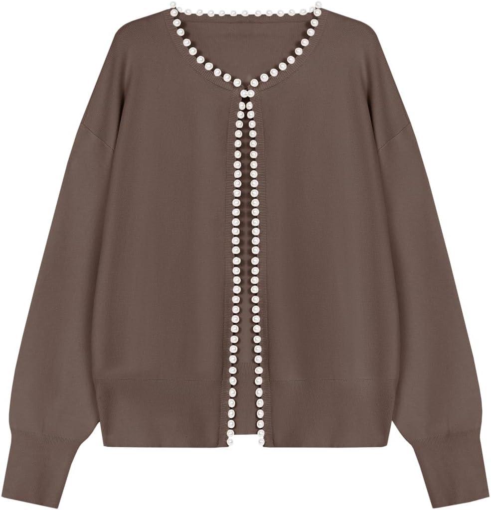 Saodimallsu Womens Fall Open Front Cardigan Sweaters Pearl Long Sleeve Knit Tops Crewneck Dressy Casual Sweater Jacket(Brown)