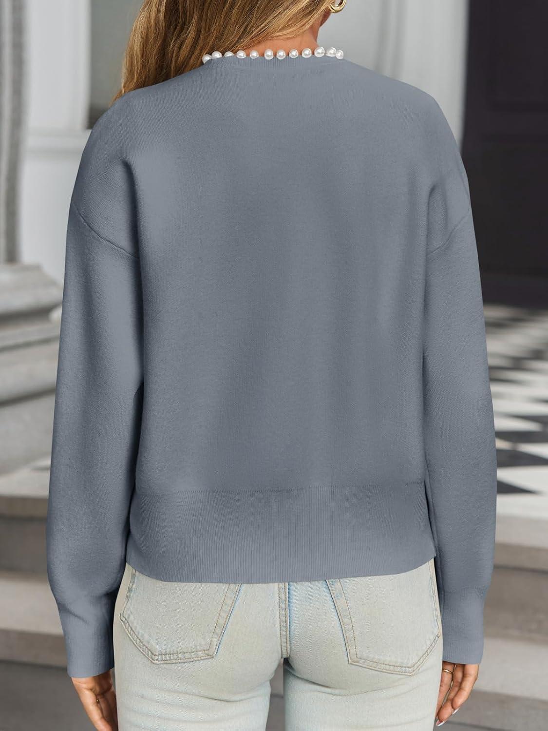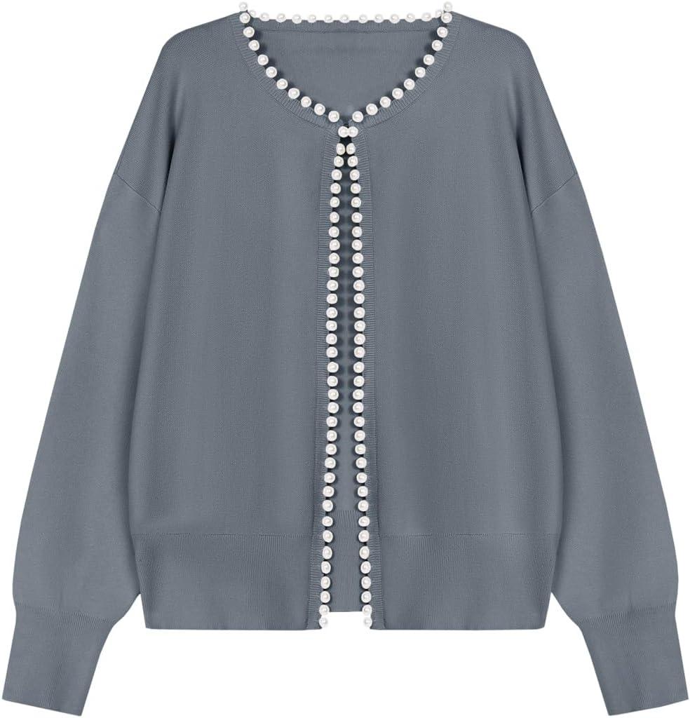 Saodimallsu Womens Fall Open Front Cardigan Sweaters Pearl Long Sleeve Knit Tops Crewneck Dressy Casual Sweater Jacket(Grey)