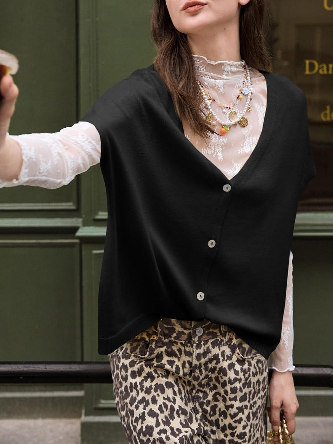Saodimallsu Womens Fall Oversized Cardigans Batwing Short Sleeve Lightweight Button V Neck Casual Knit Sweater Tops(Black)