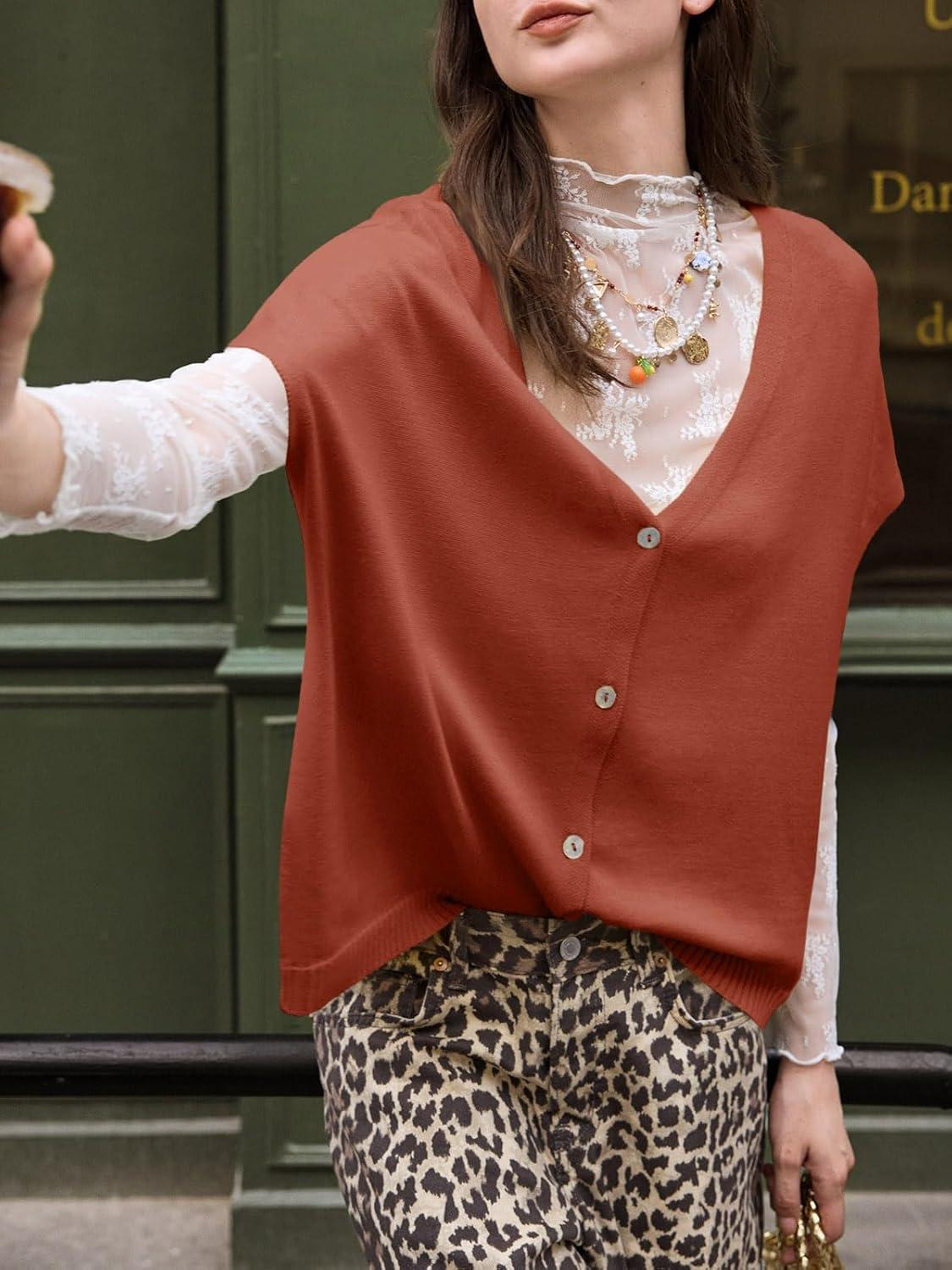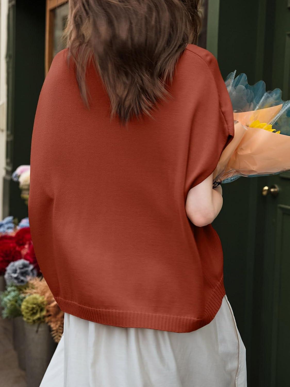 Saodimallsu Womens Fall Oversized Cardigans Batwing Short Sleeve Lightweight Button V Neck Casual Knit Sweater Tops(Brick Red)