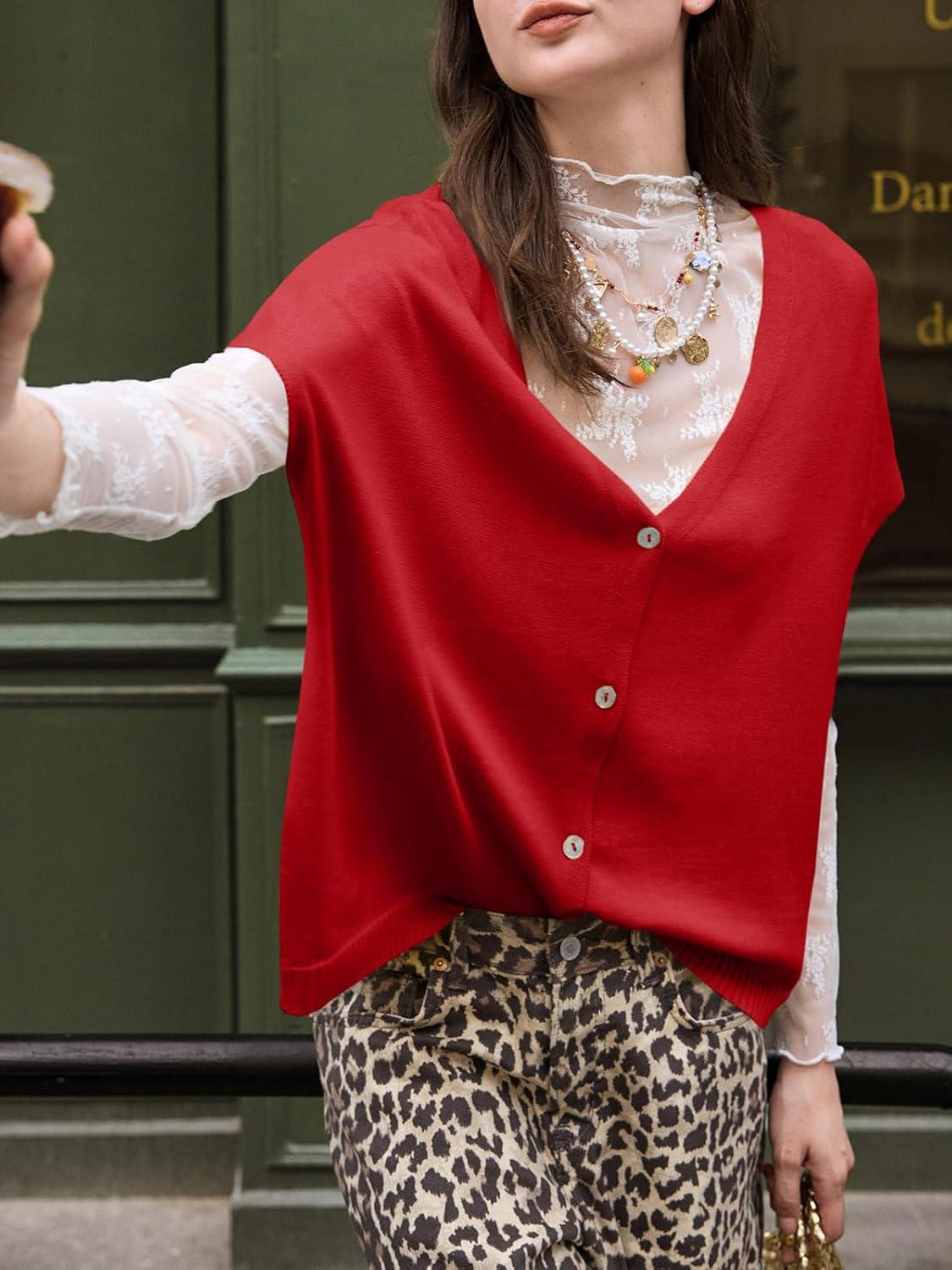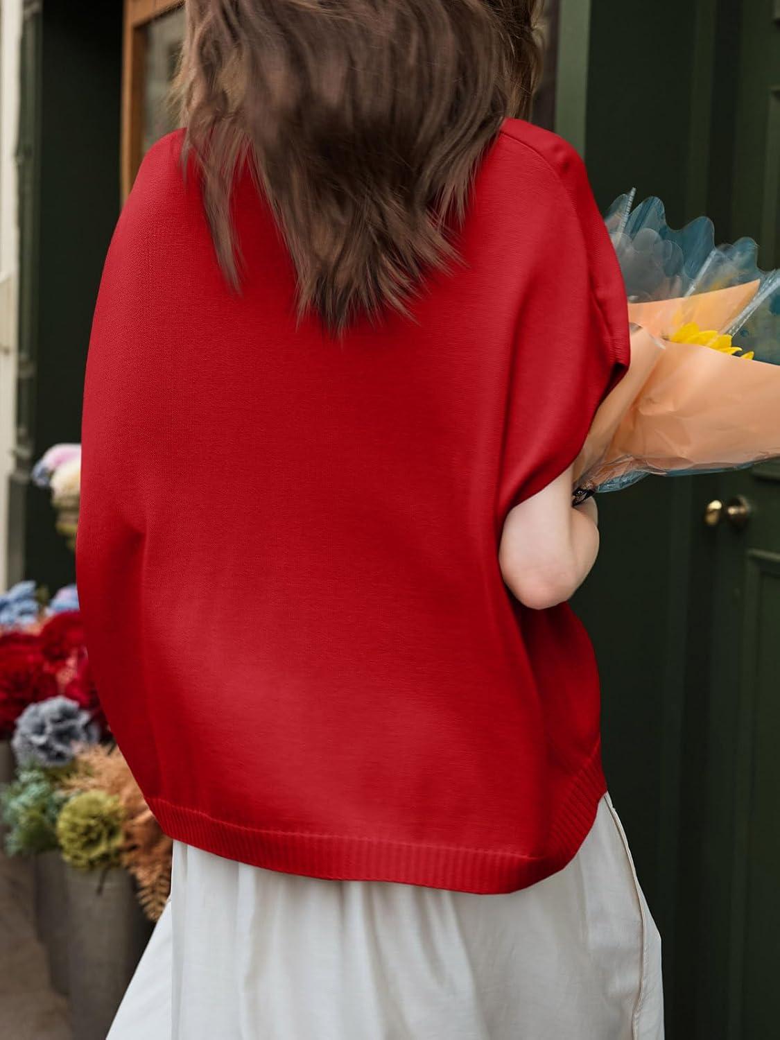 Saodimallsu Womens Fall Oversized Cardigans Batwing Short Sleeve Lightweight Button V Neck Casual Knit Sweater Tops(Red)