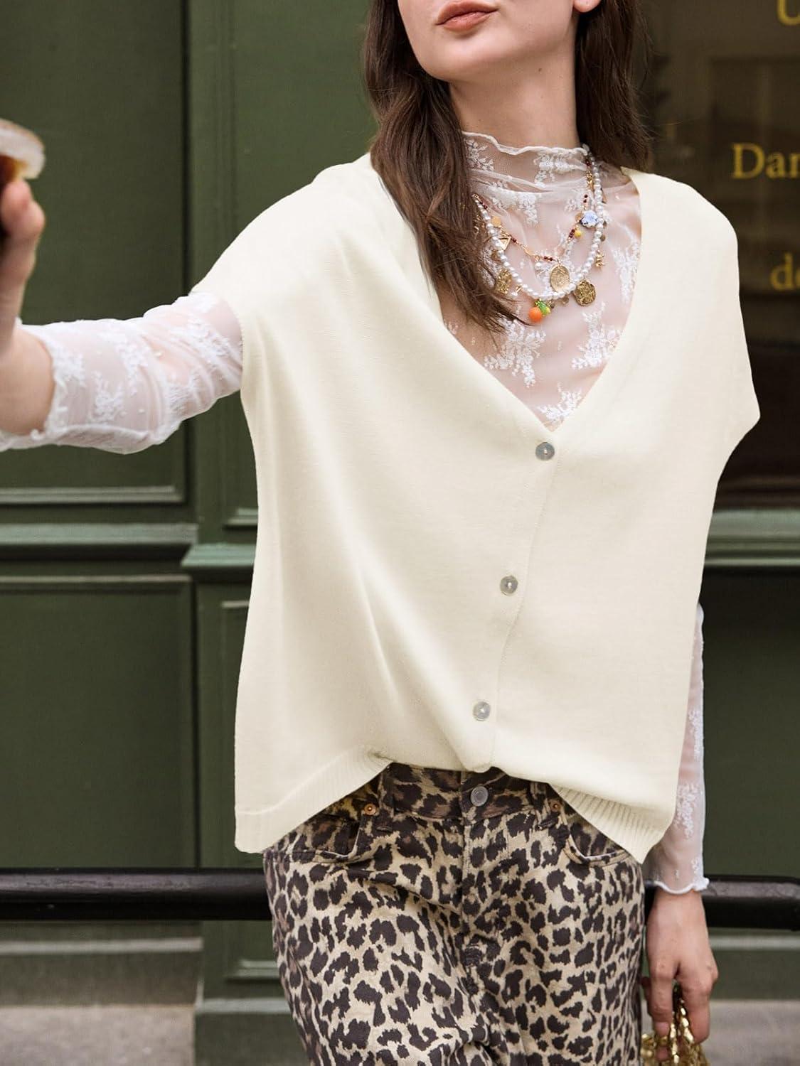 Saodimallsu Womens Fall Oversized Cardigans Batwing Short Sleeve Lightweight Button V Neck Casual Knit Sweater Tops(White)