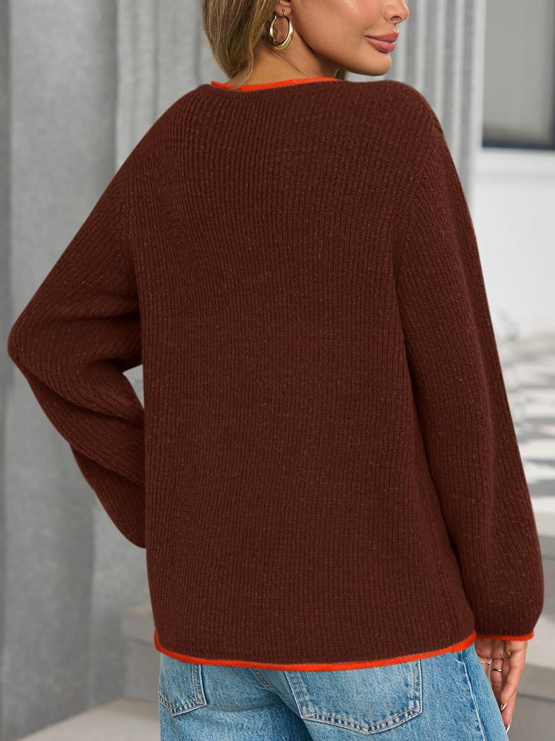 Saodimallsu Womens Fall Sweaters Long Sleeve Crew Neck Casual Trendy Chunky Ribbed Knit Color Block Loose Pullover Tops(Brown)