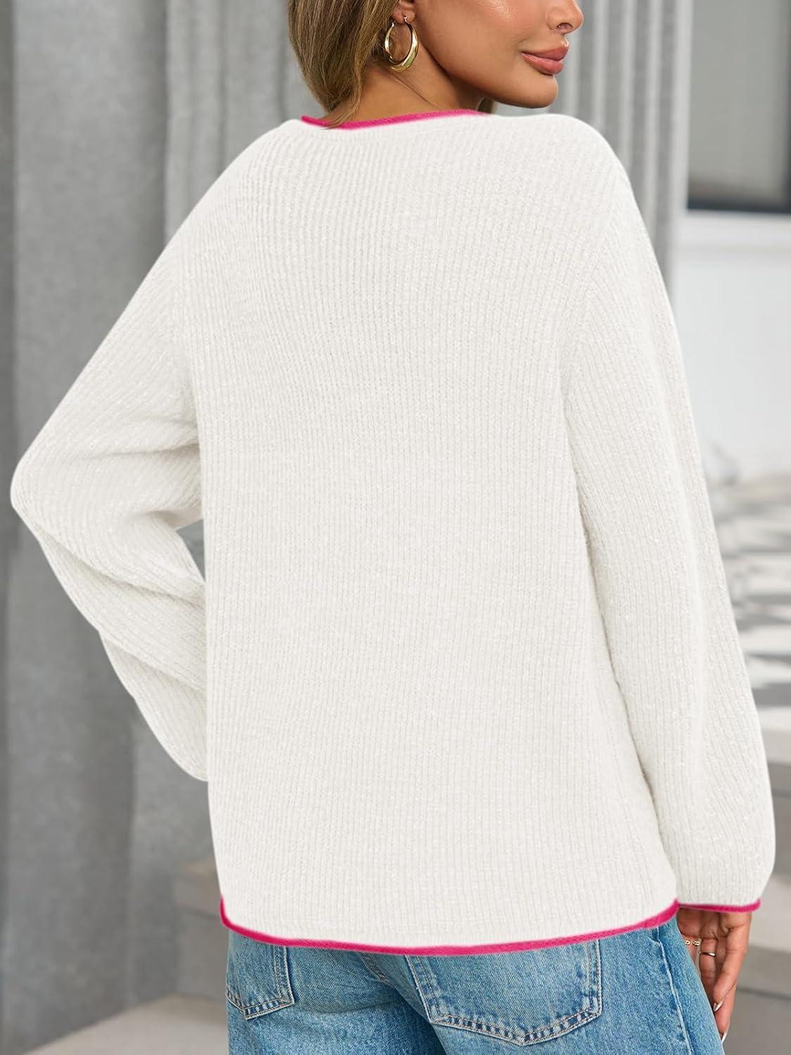 Saodimallsu Womens Fall Sweaters Long Sleeve Crew Neck Casual Trendy Chunky Ribbed Knit Color Block Loose Pullover Tops(White)