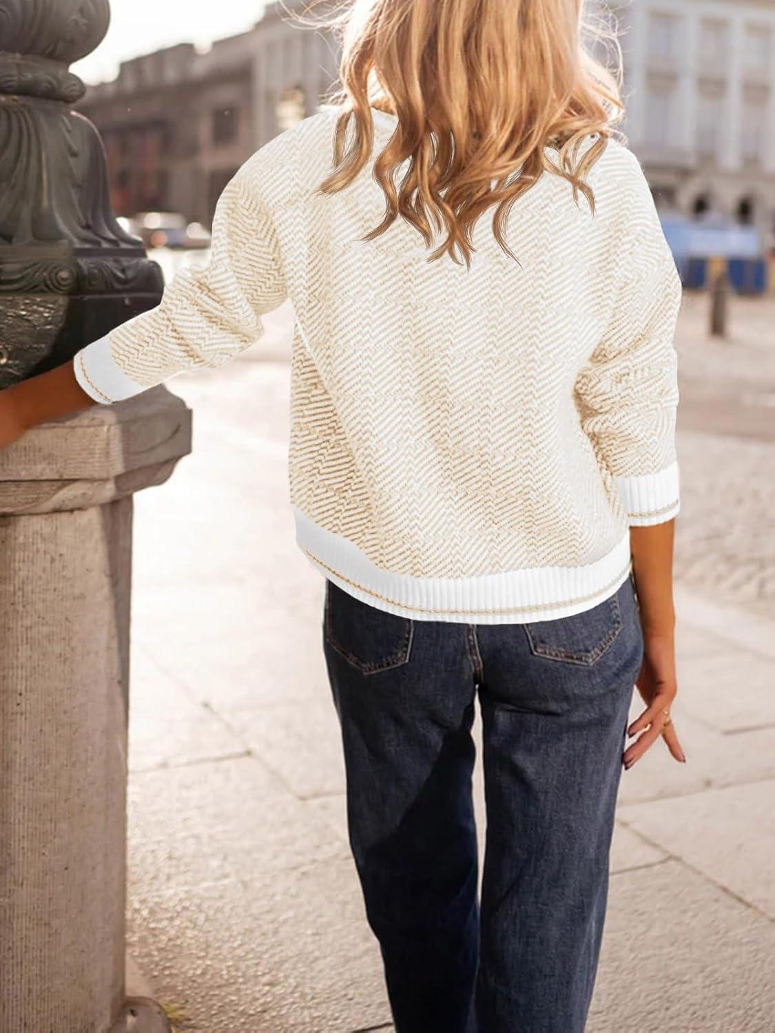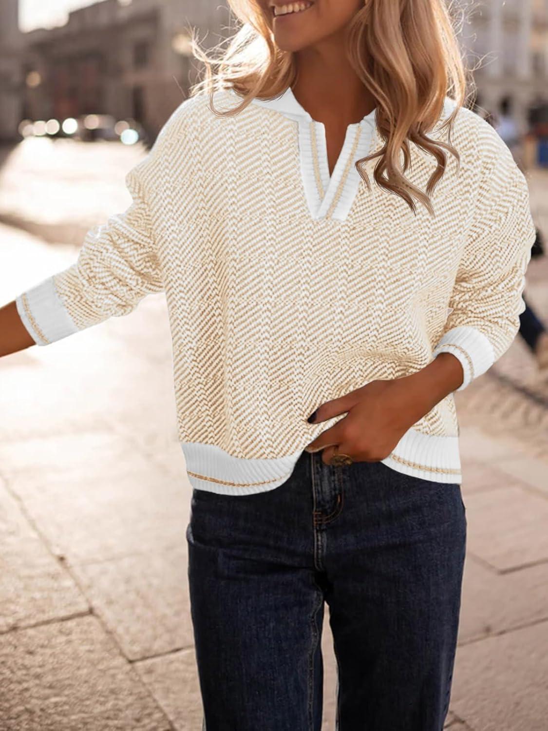 Saodimallsu Womens Fall Sweaters Tops Lapel V Neck Knit Sweater Color Block Long Sleeve Casual Soft Pullover Shirt(Apricot)