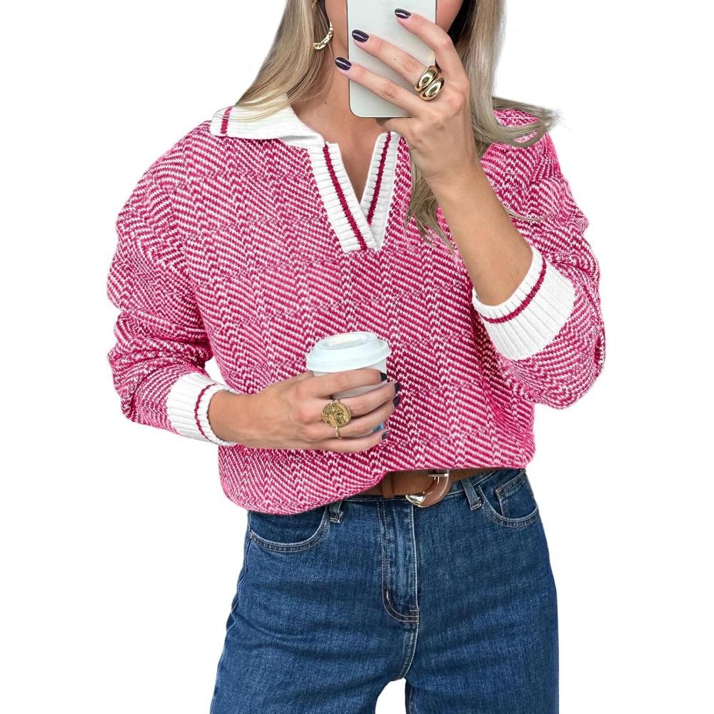 Saodimallsu Womens Fall Sweaters Tops Lapel V Neck Knit Sweater Color Block Long Sleeve Casual Soft Pullover Shirt(Bright Pink)
