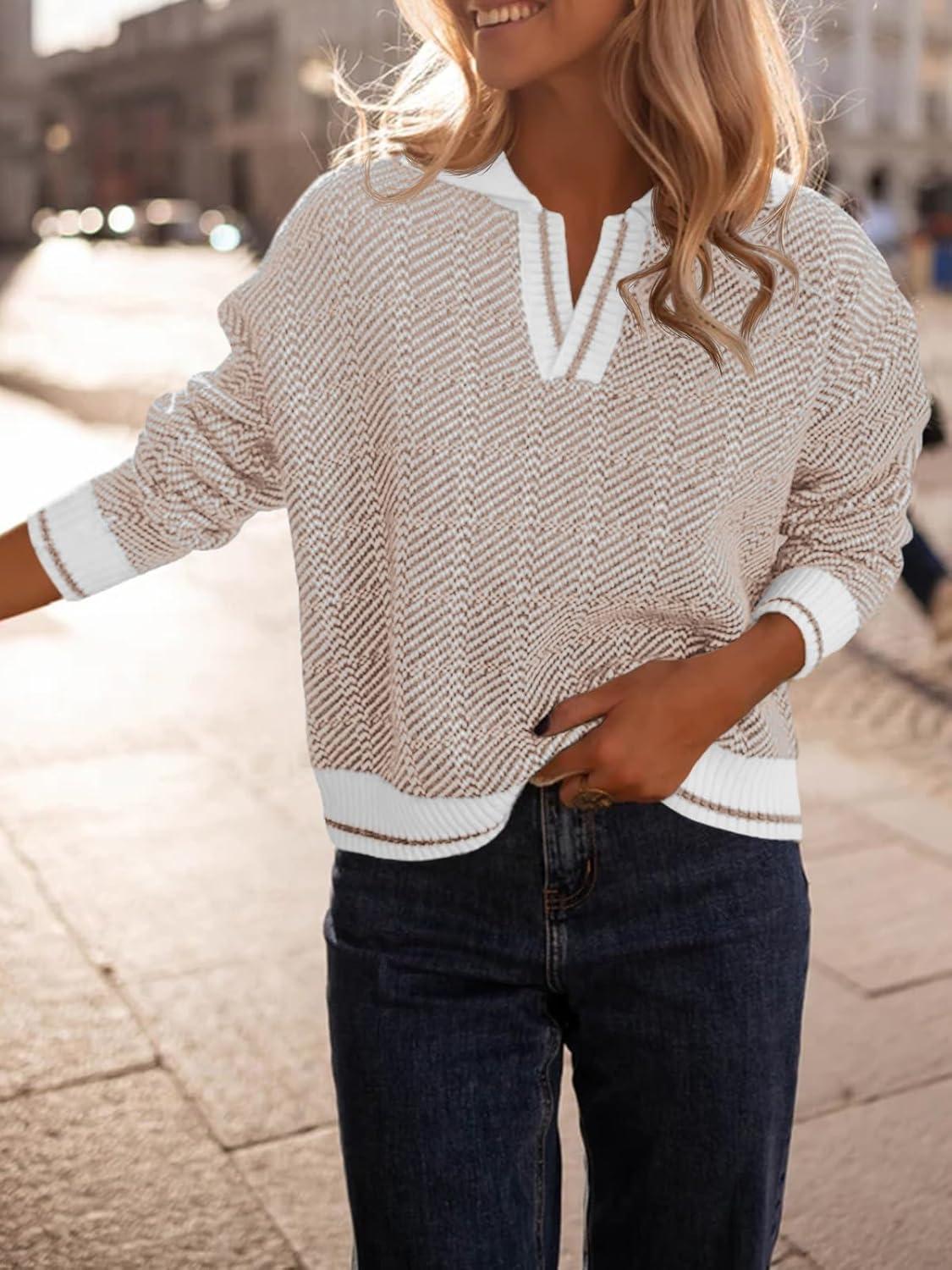 Saodimallsu Womens Fall Sweaters Tops Lapel V Neck Knit Sweater Color Block Long Sleeve Casual Soft Pullover Shirt(Khaki)