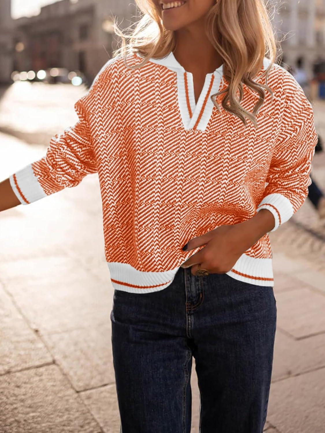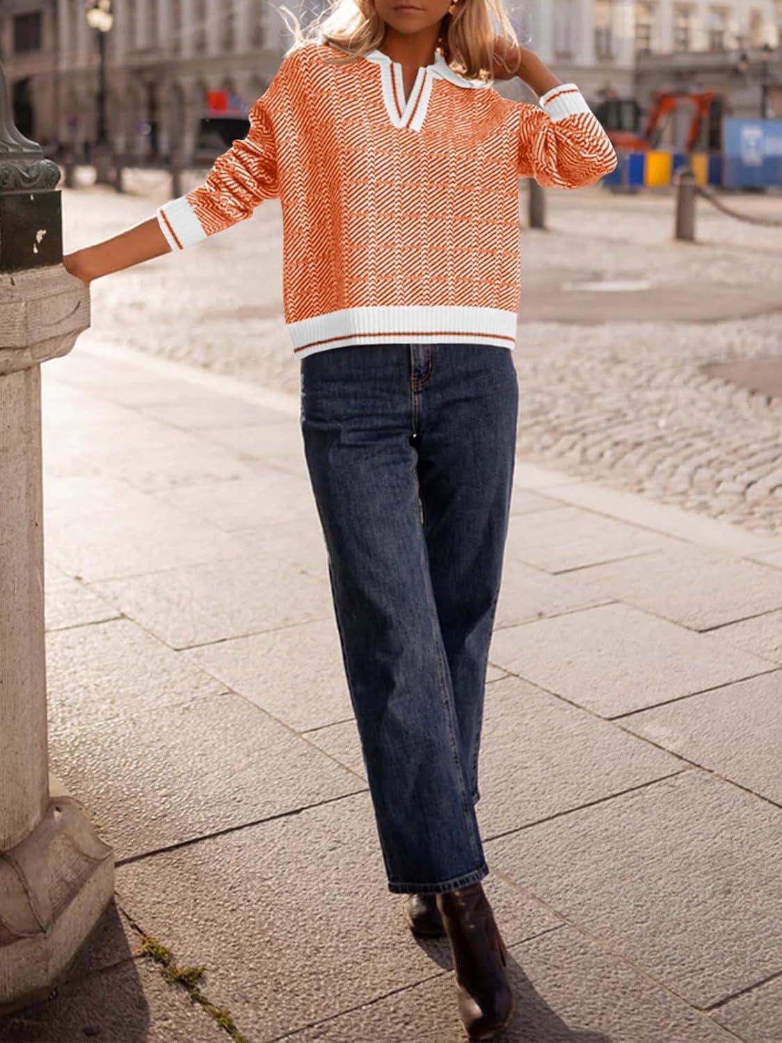 Saodimallsu Womens Fall Sweaters Tops Lapel V Neck Knit Sweater Color Block Long Sleeve Casual Soft Pullover Shirt(Orange)