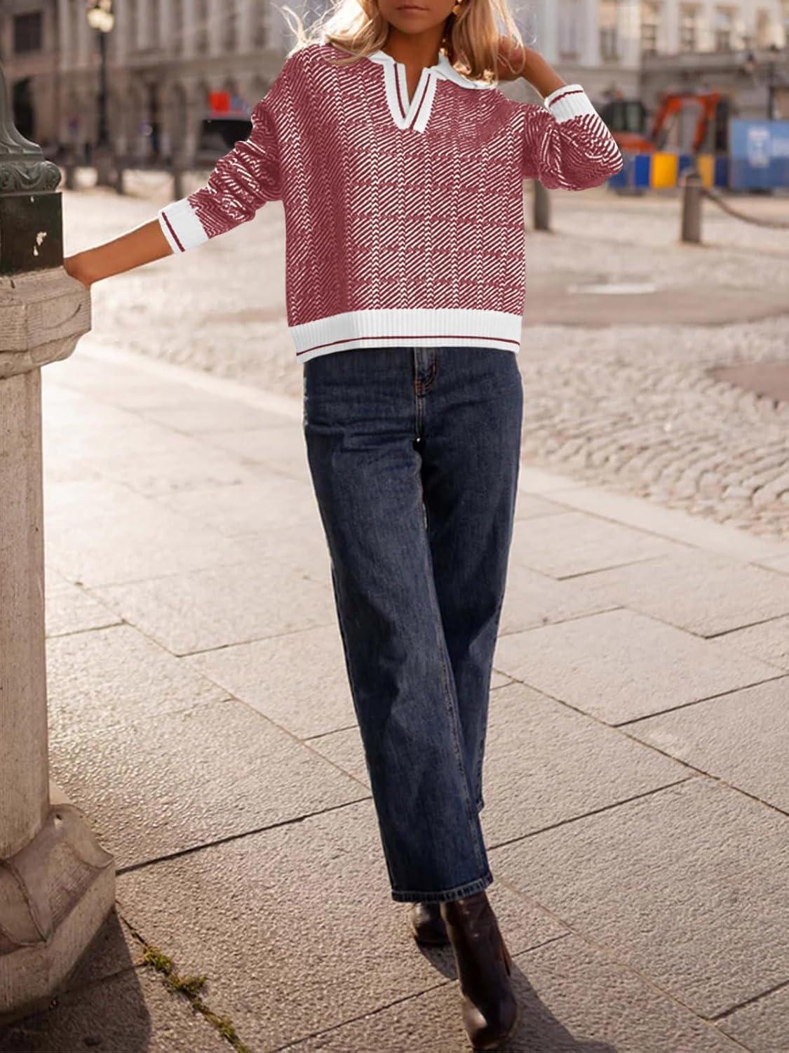 Saodimallsu Womens Fall Sweaters Tops Lapel V Neck Knit Sweater Color Block Long Sleeve Casual Soft Pullover Shirt(Red)
