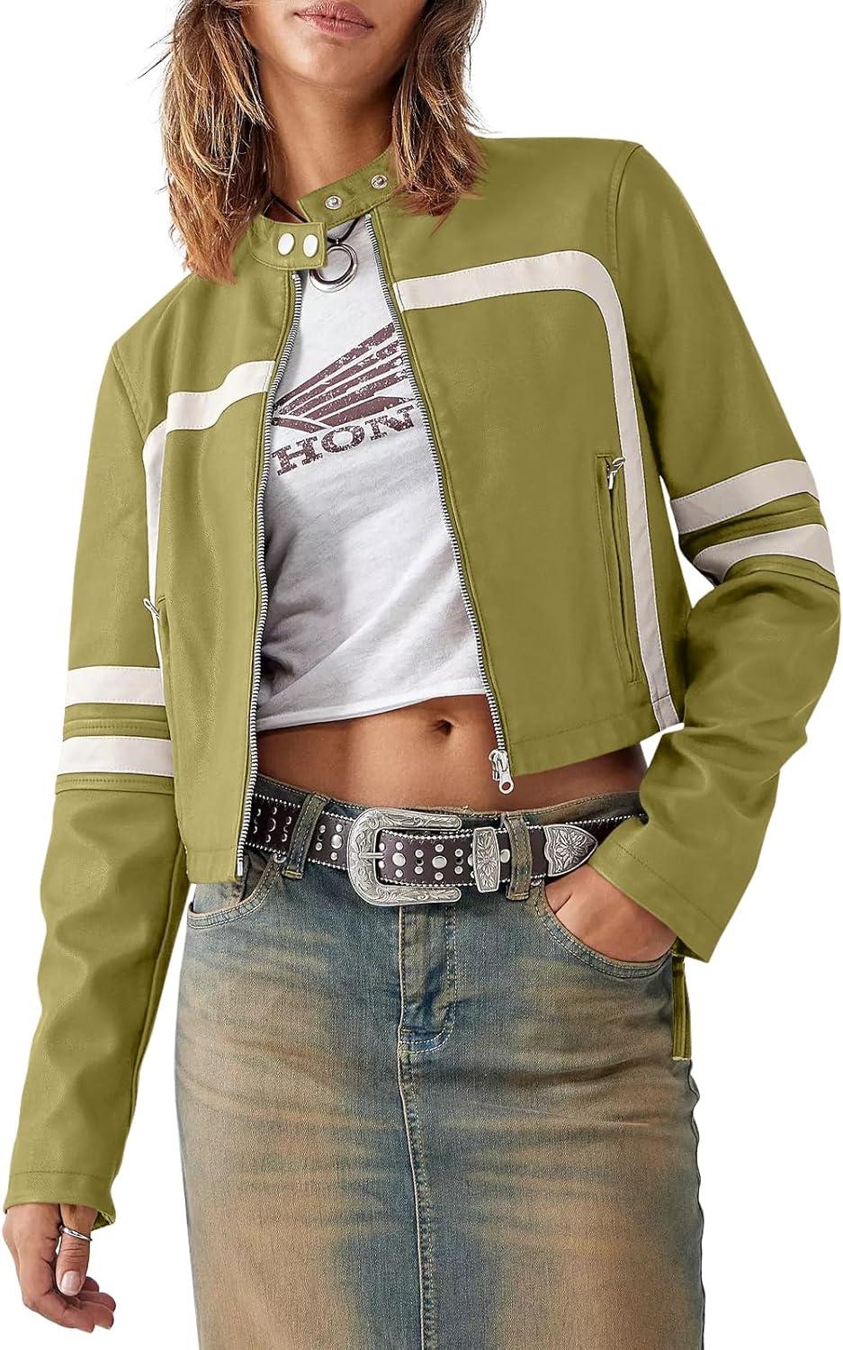 Saodimallsu Women’s Faux Leather Jackets Zip Up Stand Collar Cropped Motocross PU Coats(Green)
