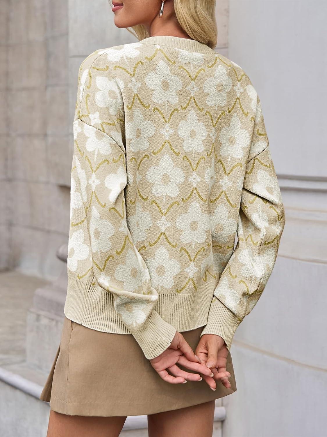 Saodimallsu Womens Floral Cardigan Sweaters Long Sleeve Open Front Button Down Knit Retro Sweater Coat Outwear Fall 2025(Beige)