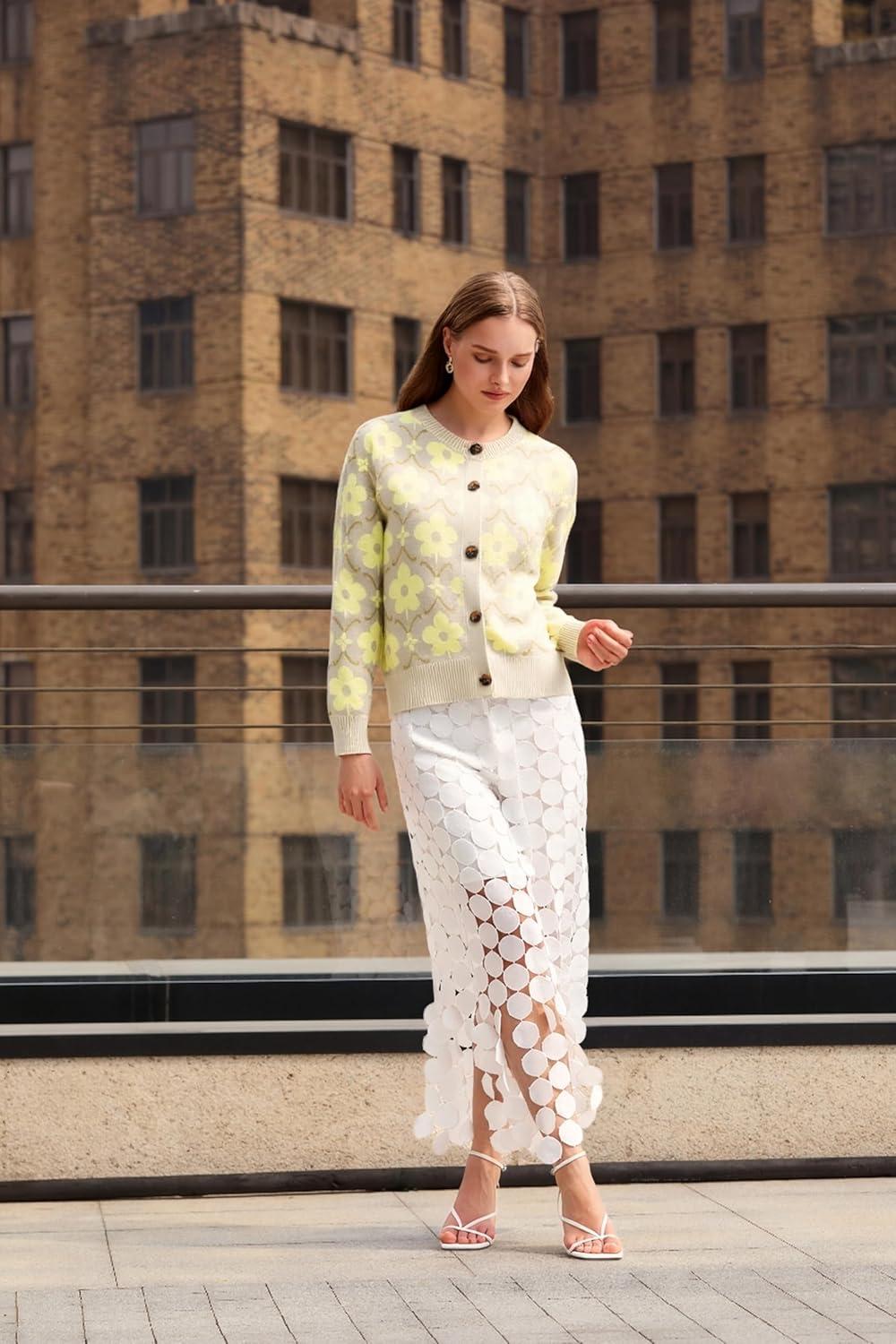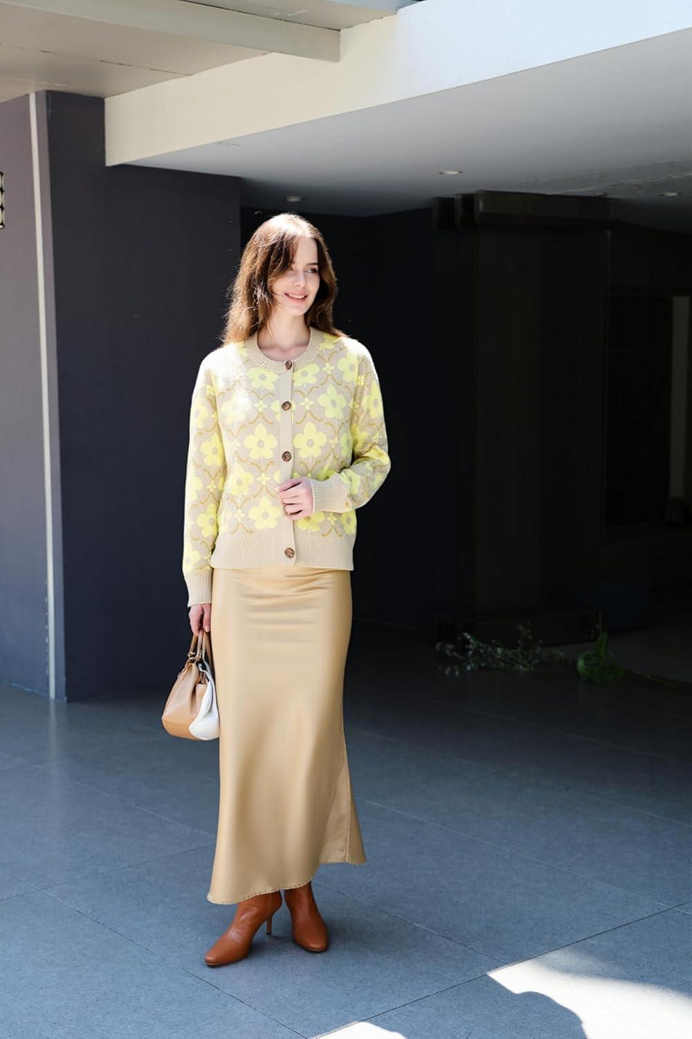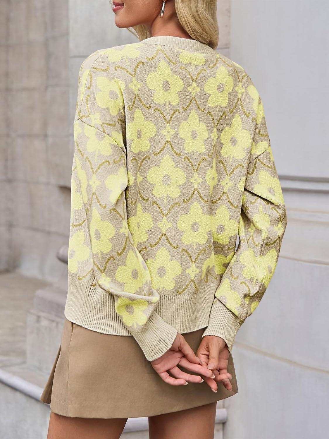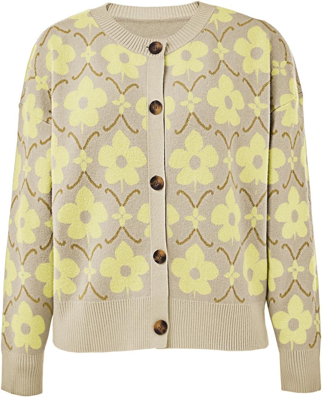 Saodimallsu Womens Floral Cardigan Sweaters Long Sleeve Open Front Button Down Knit Retro Sweater Coat Outwear Fall 2025(Yellow)
