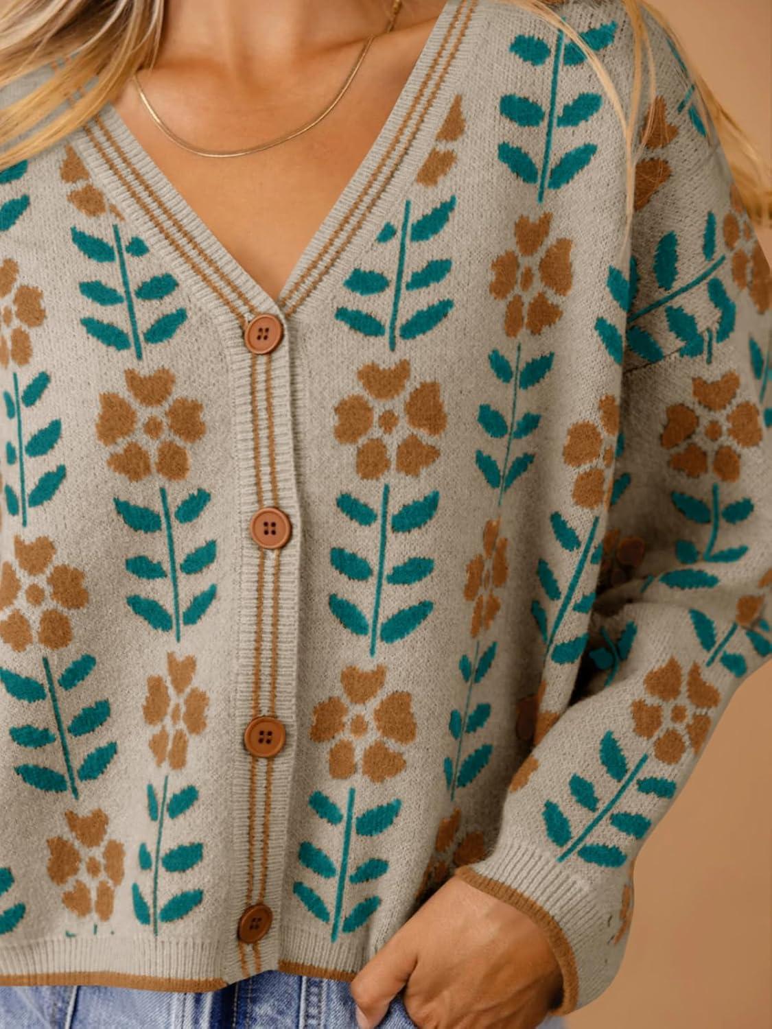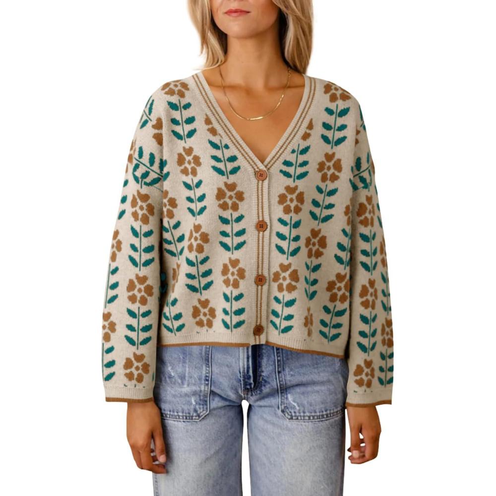 Saodimallsu Womens Floral Print V Neck Cardigan Open Front Button Down Knit Sweater Long Sleeve Loose Fashion Tops(Apricot)