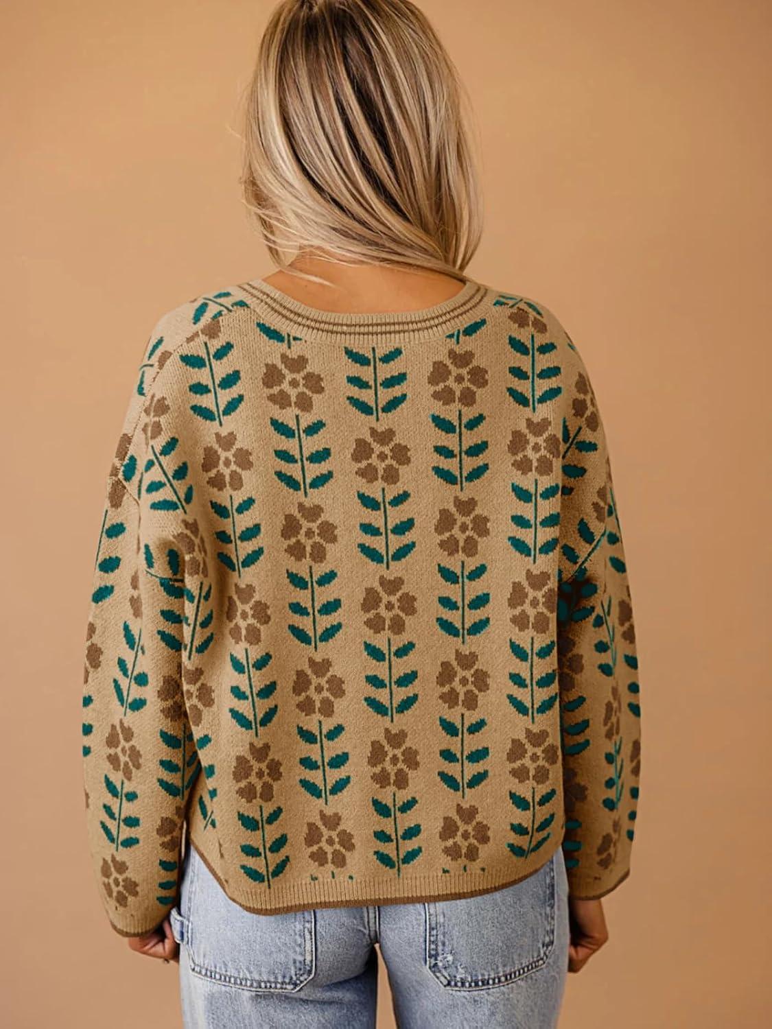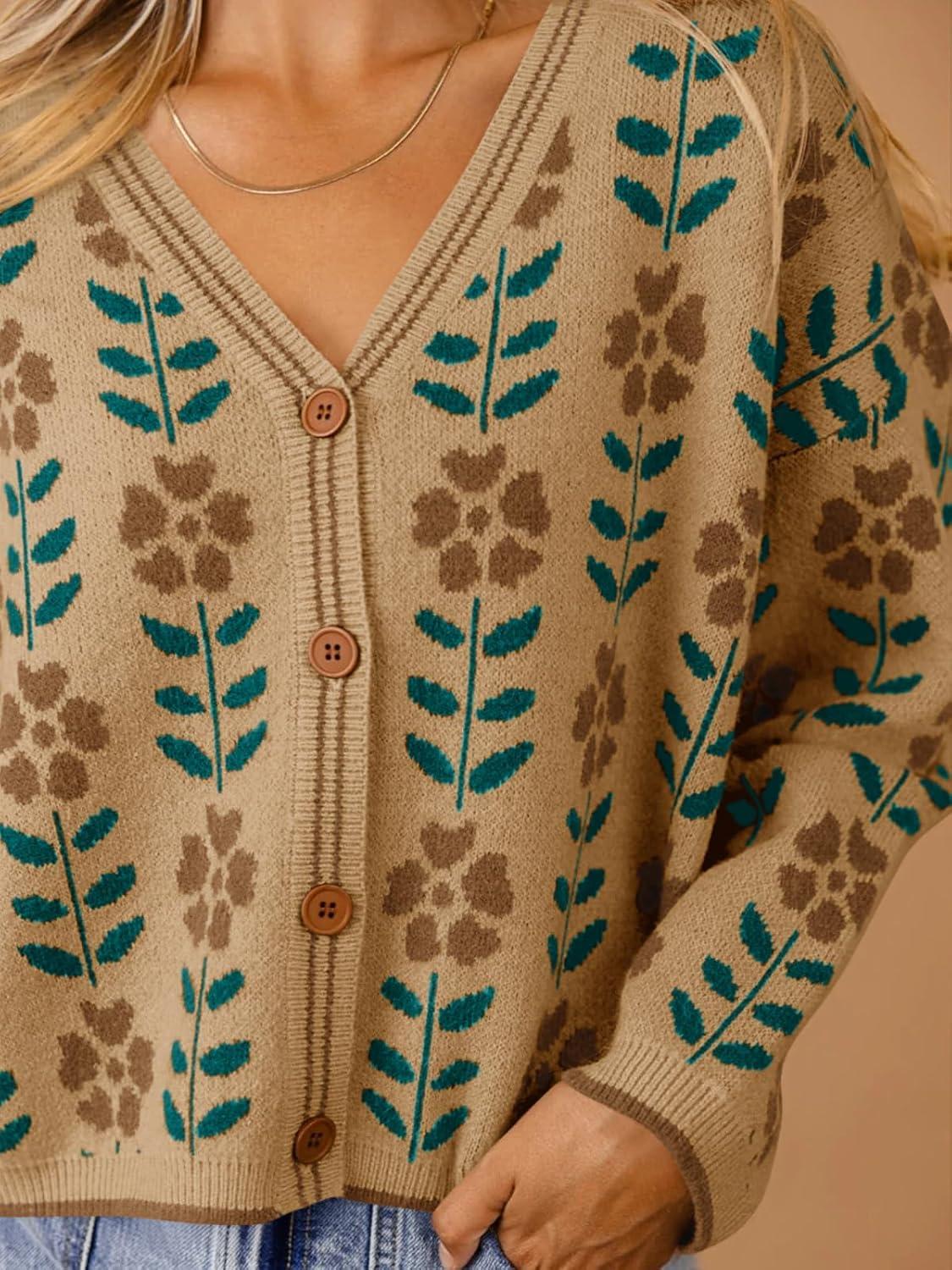 Saodimallsu Womens Floral Print V Neck Cardigan Open Front Button Down Knit Sweater Long Sleeve Loose Fashion Tops(Brown)