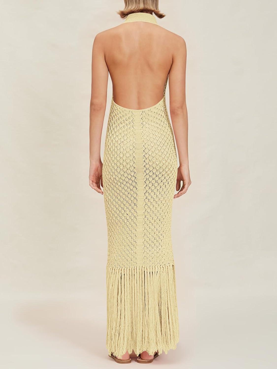Saodimallsu Womens Halter Crochet Cover Up Fringe Sexy Backless Sleeveless V Neck Collared Vacation Beach Maxi Dress(Beige)