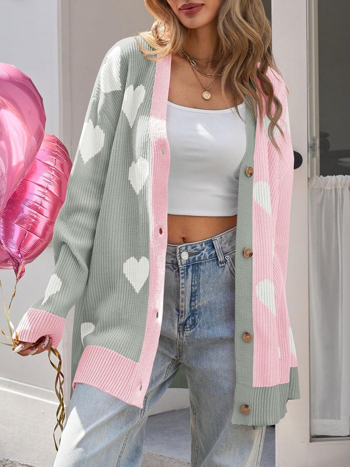 Saodimallsu Womens Heart Cardigan Sweaters Valentines Oversized Winter Color Block Button Up Cute Ribbed Sweater Coats(Grey)