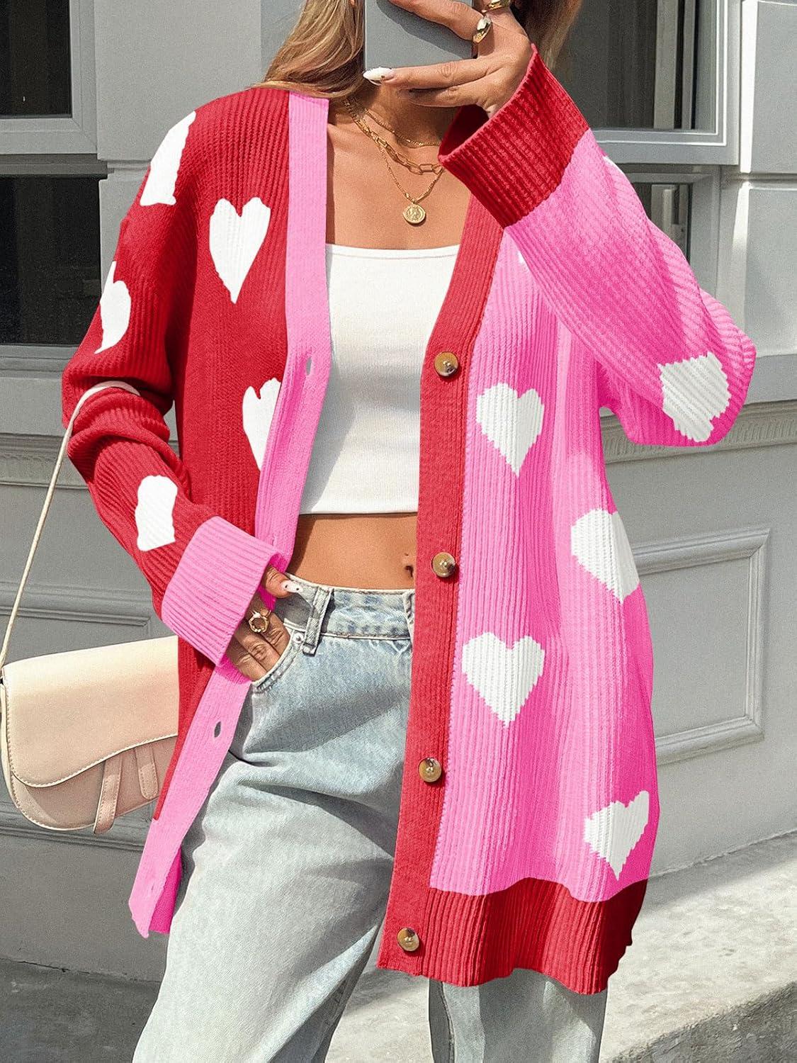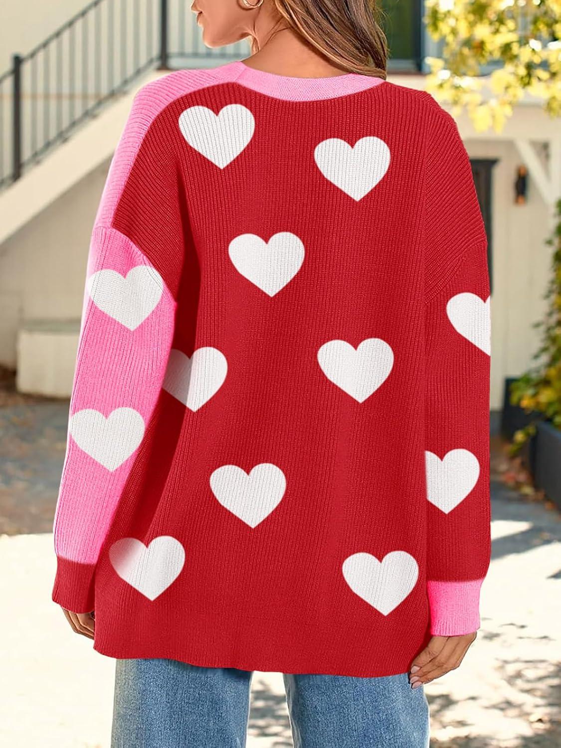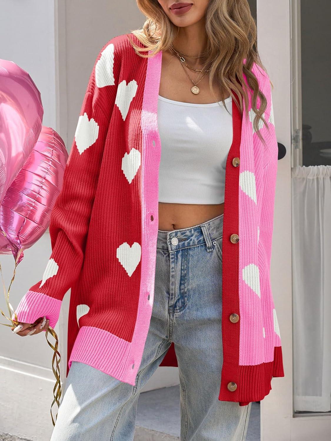 Saodimallsu Womens Heart Cardigan Sweaters Valentines Oversized Winter Color Block Button Up Cute Ribbed Sweater Coats(Red)