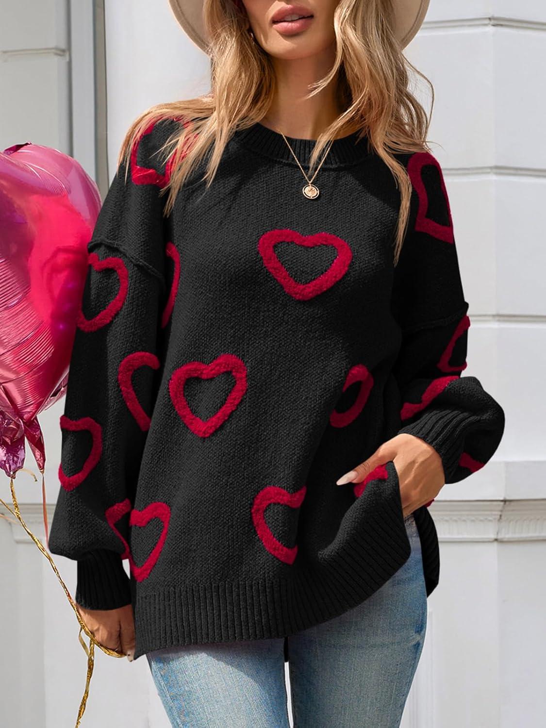 Saodimallsu Womens Heart Sweater Valentines Oversized Cute Winter Chunky Knit Crew Neck Side Slit Pullover Sweaters(Black)