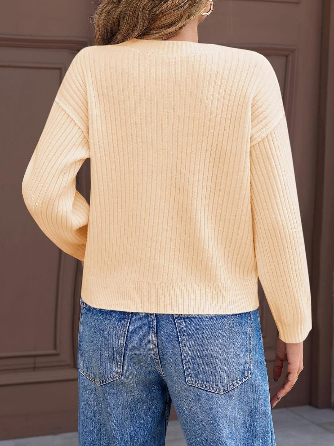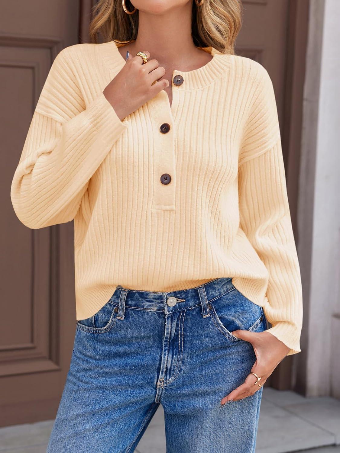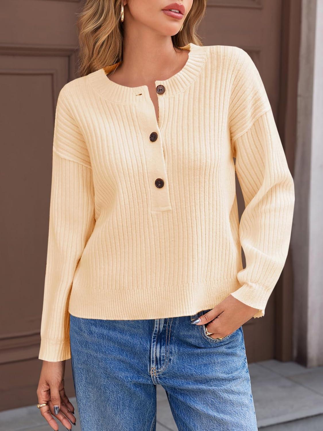 Saodimallsu Womens Henley Sweater Tops Fall Button Crew Neck Long Sleeve Trendy Loose Ribbed Knit Pullover Sweaters(Apricot)